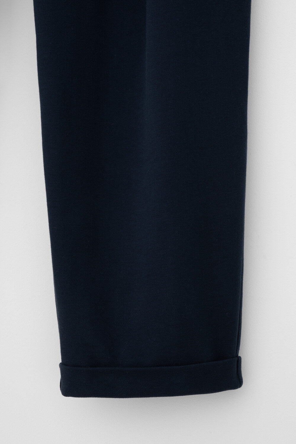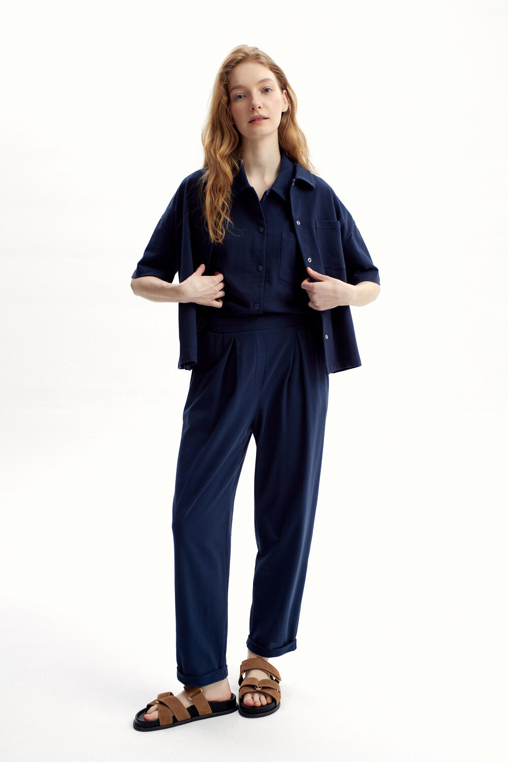 Трикотажные брюки с эластичным поясом, изготовленные из 100% хлопка, дарят ощущение комфорта и легкости. Имитация застежки и складки спереди придают изделию свободный силуэт. В сочетании с рубашкой-поло из этой коллекции, вы создадите стильный образ для теплых летних дней.