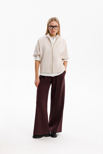 Брюки с защипами на талии, изготовленные из премиального трикотажа DOUBLE FACE, дарят ощущение комфорта и легкости. Складки спереди придают изделию свободный силуэт.