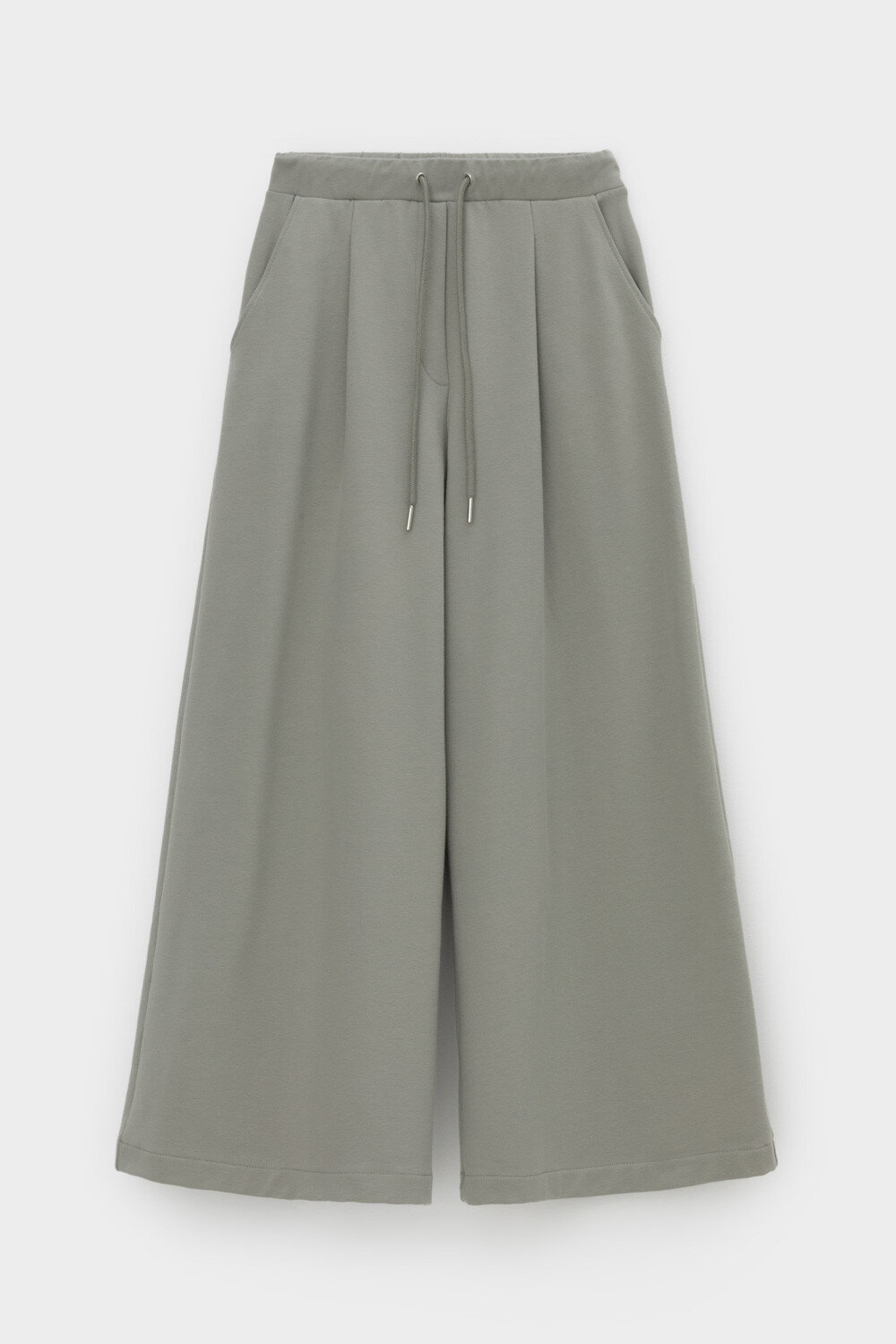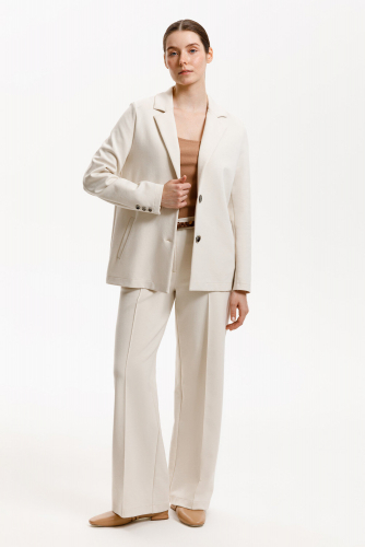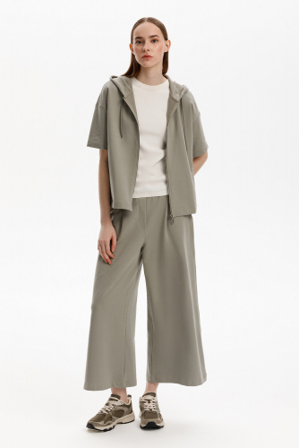 Широкие укороченные брюки из мягкого эластичного футера создают непринужденный образ. Высокий пояс с имитацией застежки и защипы придают брюкам расслабленный стиль. Подарите себе комфорт и свободу с нашим качеством.