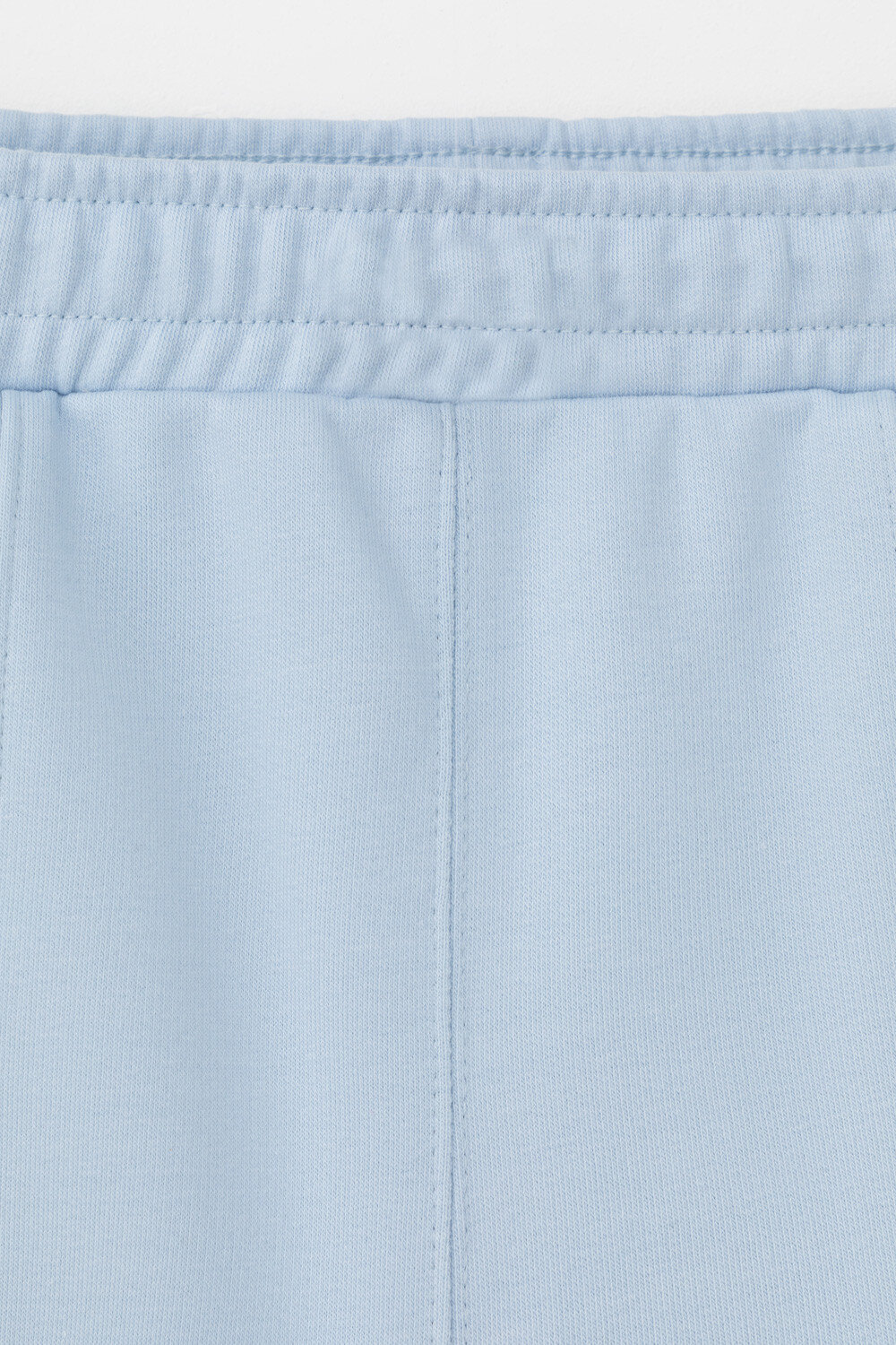 Брюки свободного силуэта со стрелками из мягкого двухцветного футера. Внутренняя сторона изделия представлена в натуральном цвете хлопка, внешняя в нежно-голубом. За счет использования крашенной пряжи, данный вид полотна прошел минимальную обработку, что придало изделию мягкость и шелковистость.