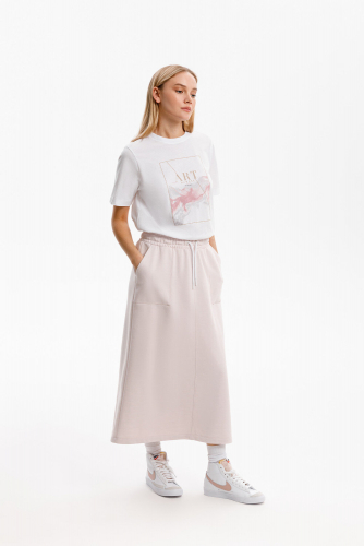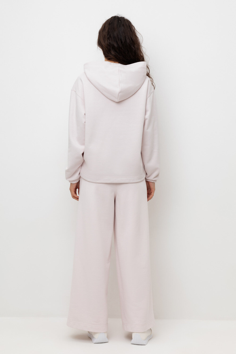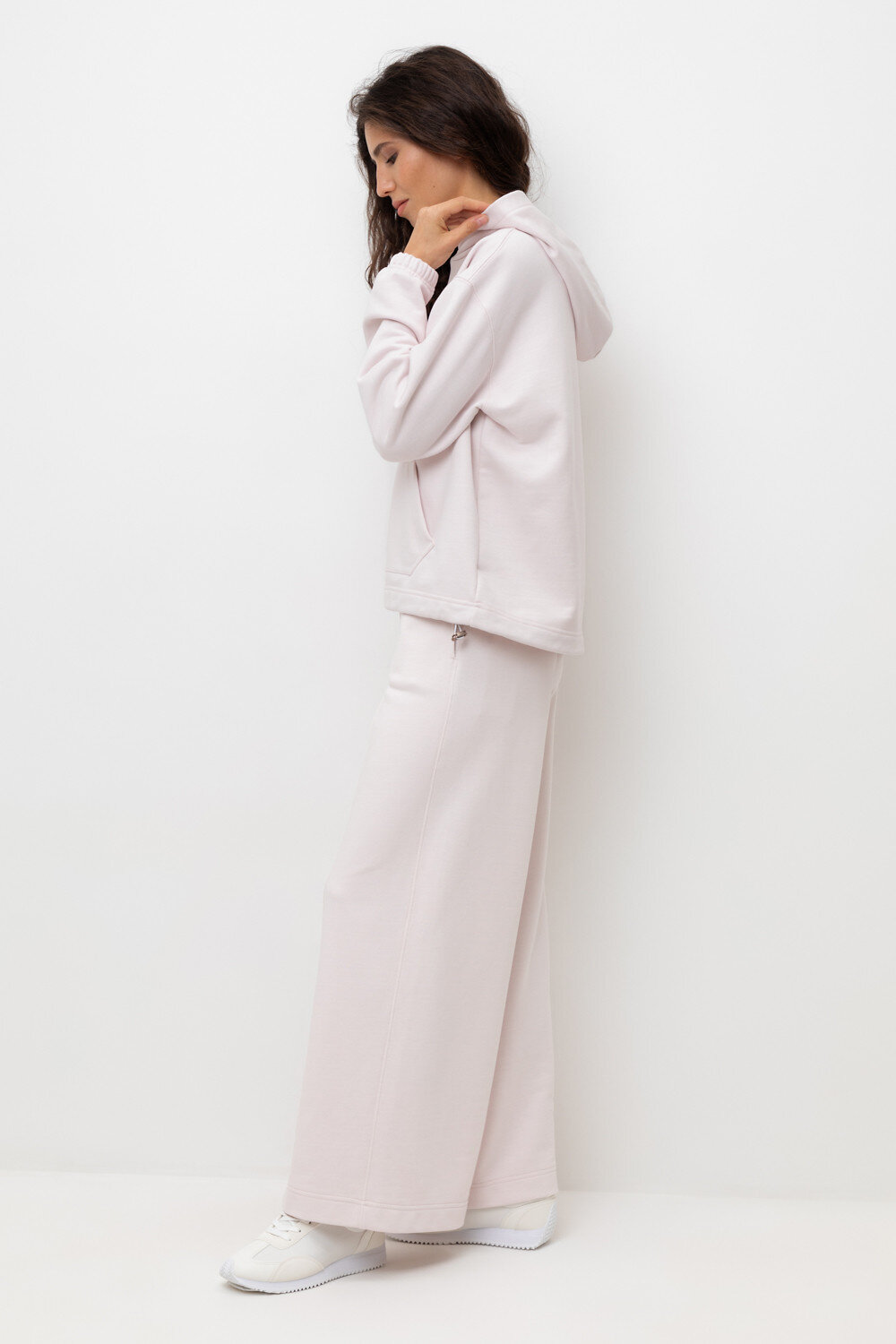 Брюки свободного силуэта со стрелками из мягкого двухцветного футера. Внутренняя сторона изделия представлена в натуральном цвете хлопка, внешняя в нежно-розовом. За счет использования крашенной пряжи, данный вид полотна прошел минимальную обработку, что придало изделию мягкость и шелковистость.