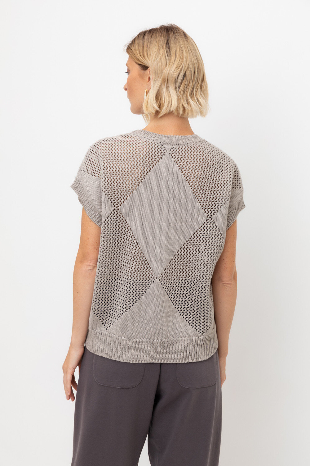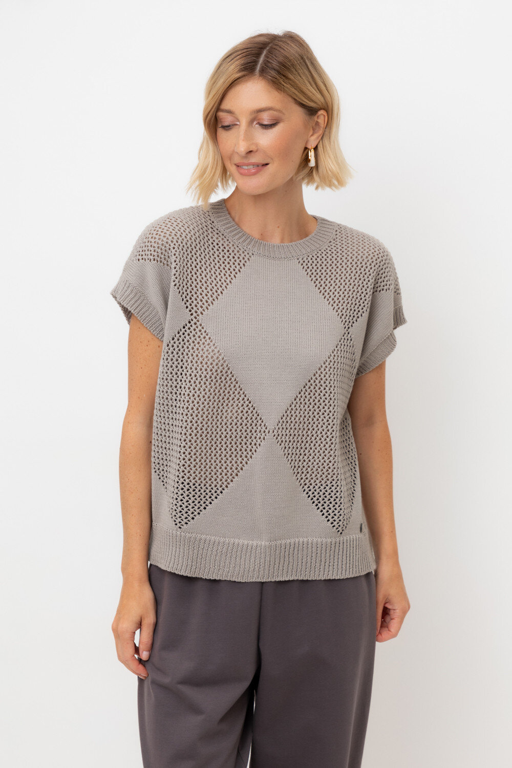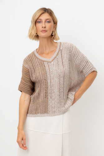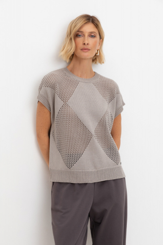 Джемпер со спущенным плечом ажурной вязки из итальянского хлопка. Умеренное переплетение, хлопок в составе придают изделию форму и ощущение комфорта во время носки. Незаменим в повседневном летнем гардеробе.