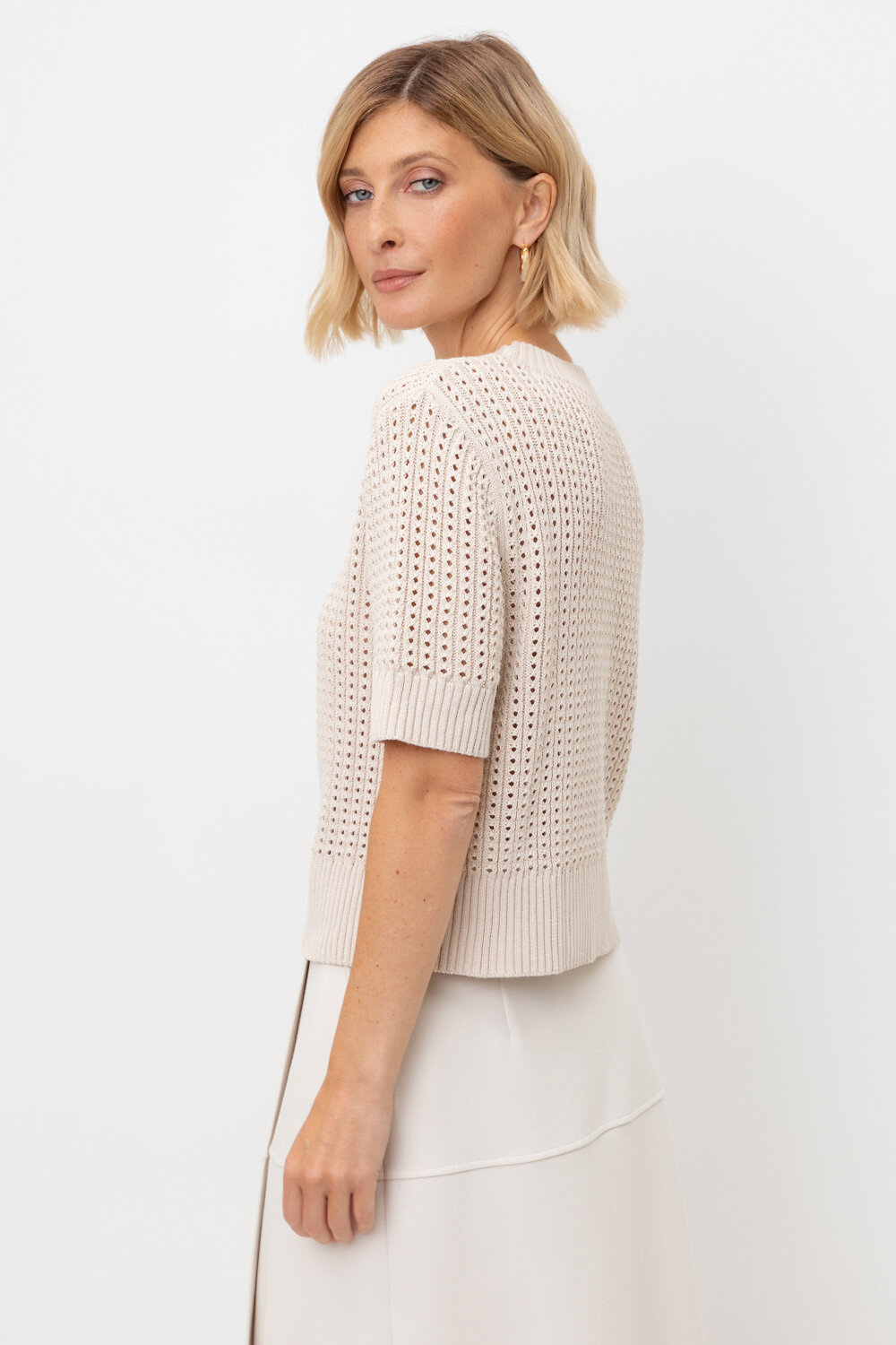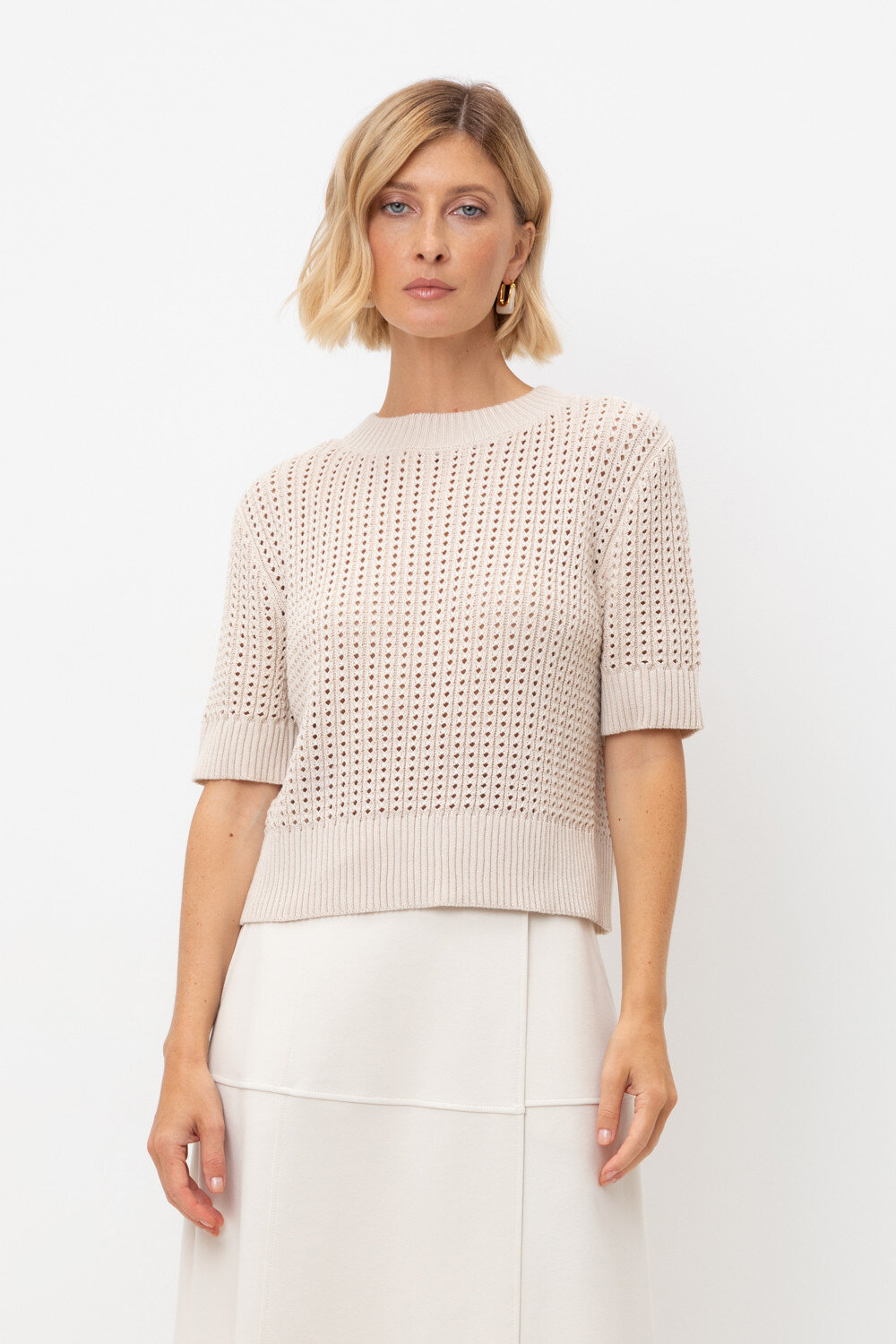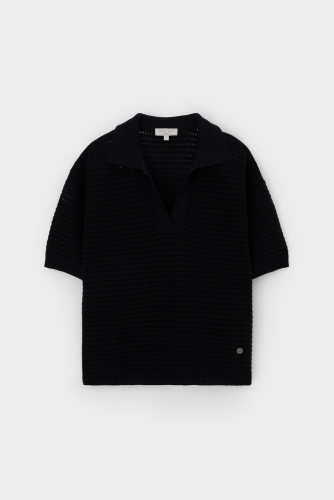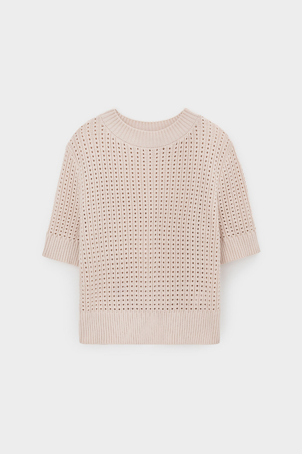 Джемпер с коротким рукавом ажурной вязки из итальянского хлопка. Умеренное переплетение, хлопок в составе придают изделию форму и дают ощущение комфорта во время носки. Незаменим в повседневном летнем гардеробе.