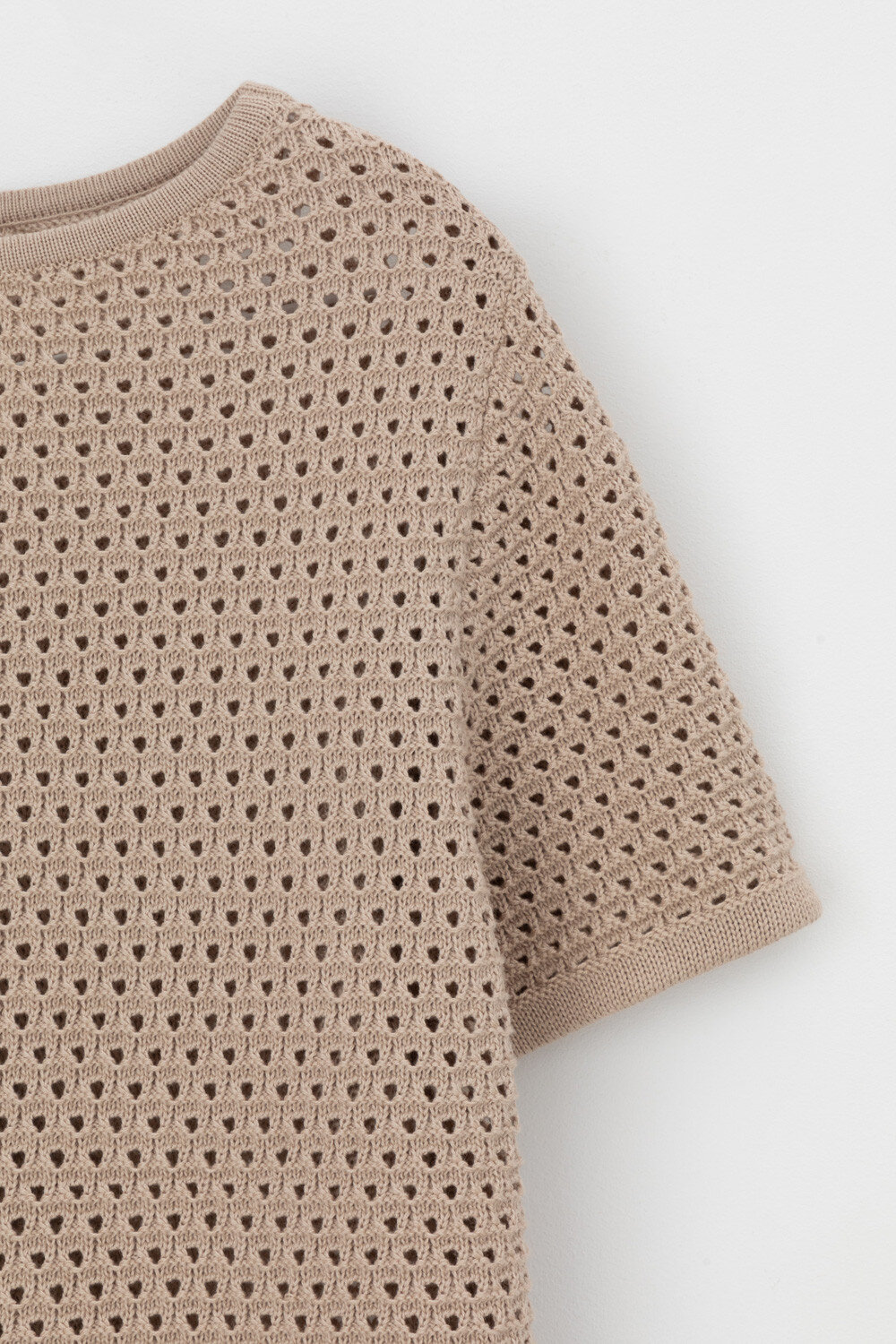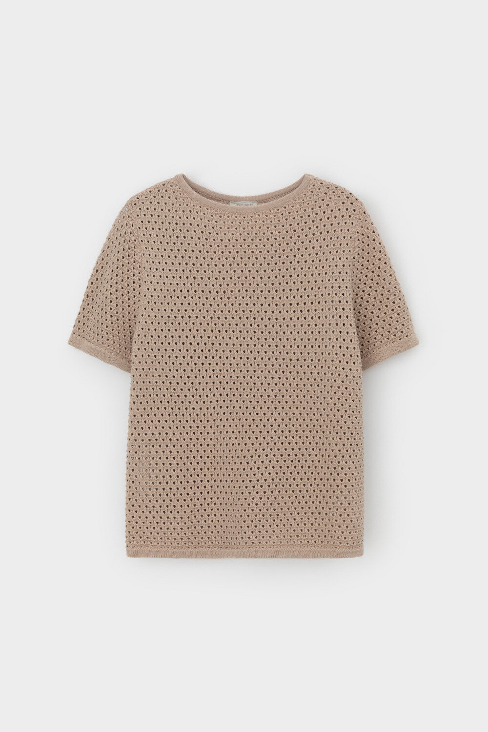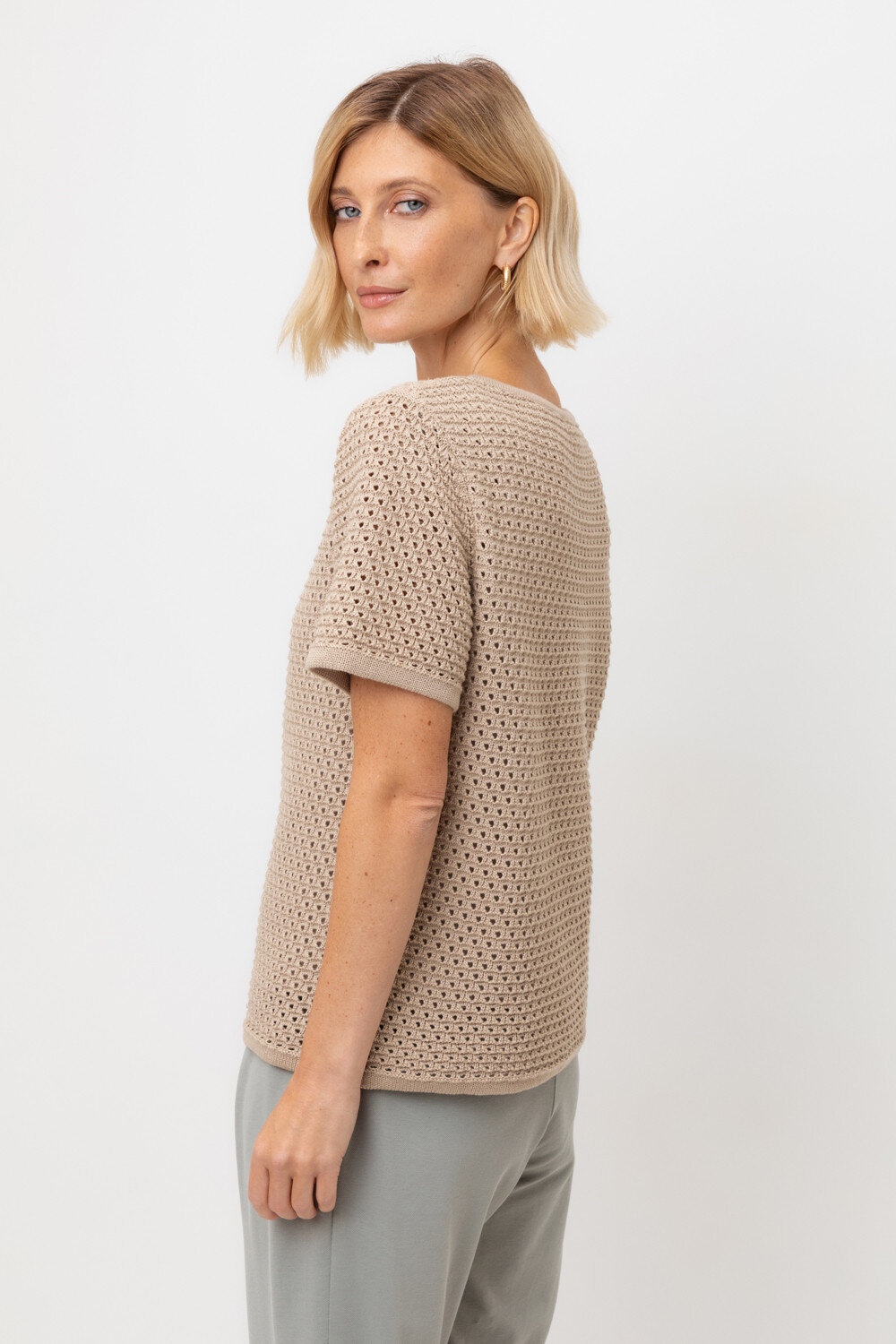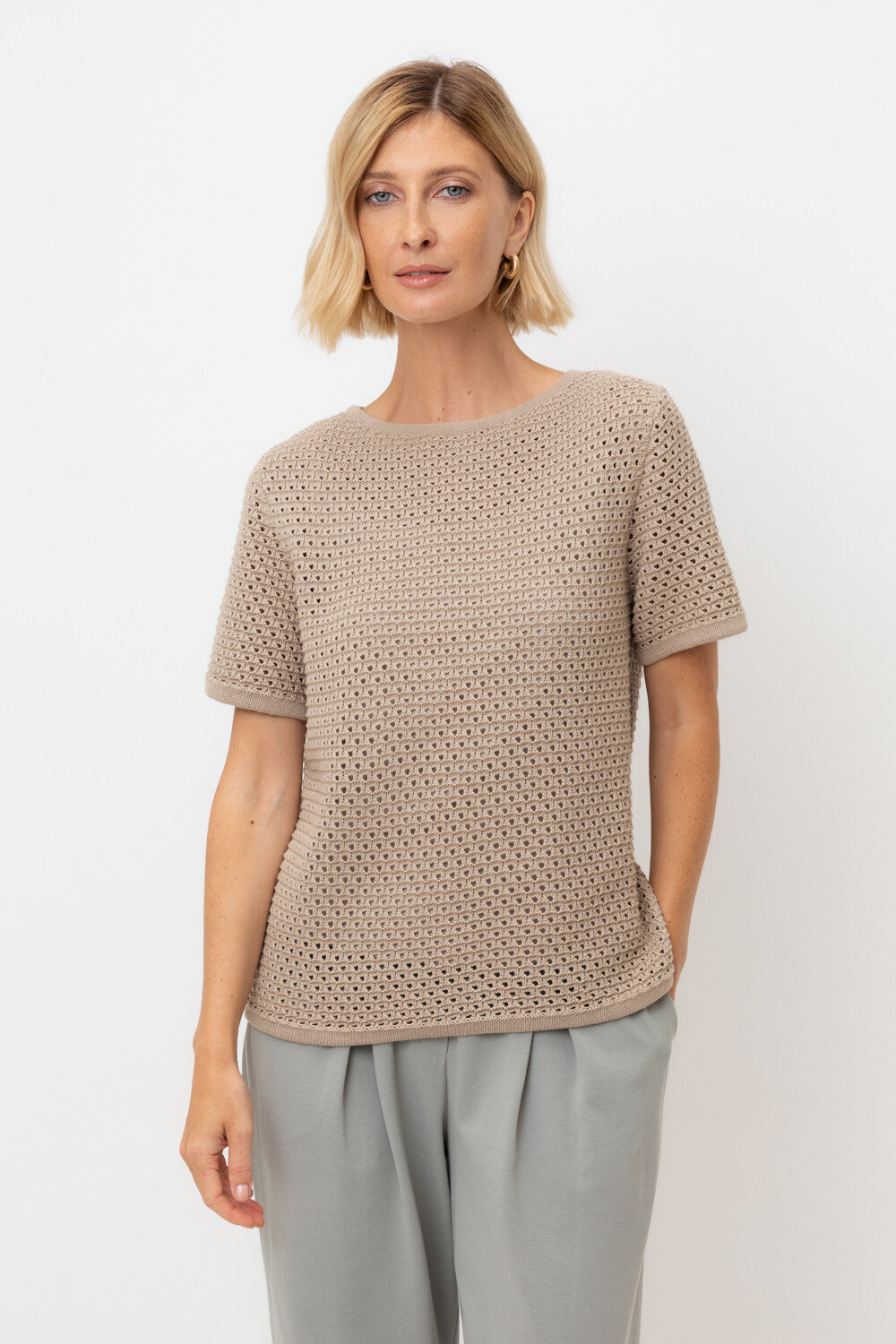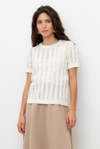 Джемпер с коротким рукавом ажурной вязки из итальянского хлопка. Умеренное переплетение, хлопок в составе придают изделию форму и дают ощущение комфорта во время носки. Незаменим в повседневном летнем гардеробе.