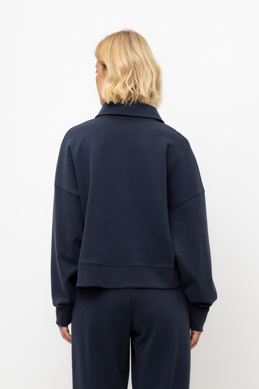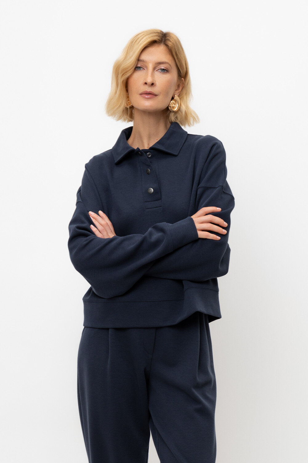 Джемпер-поло из высококачественного трикотажного полотна. За счет фактуры переплетения и специальных обработок сохраняют силуэт и форму. Хлопок в составе добавляет комфорт при носке. Выделяется благодаря спущенной линии плеча, что отличает его от традиционных моделей. Широкие манжеты и пояс формируют расслабленный стиль.