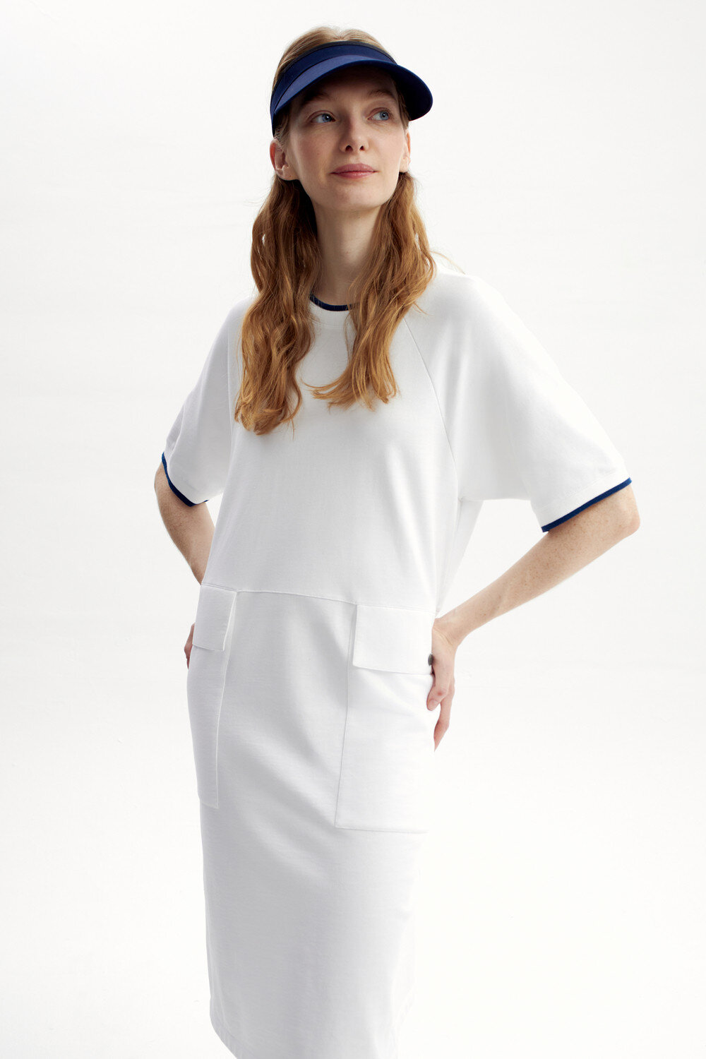 Летнее платье для создания спортивного образа из трикотажного полотна футер, изготовленного из гребенной пряжи. Декоративные манжеты и горловина выполнены из эластичного трикотажа.