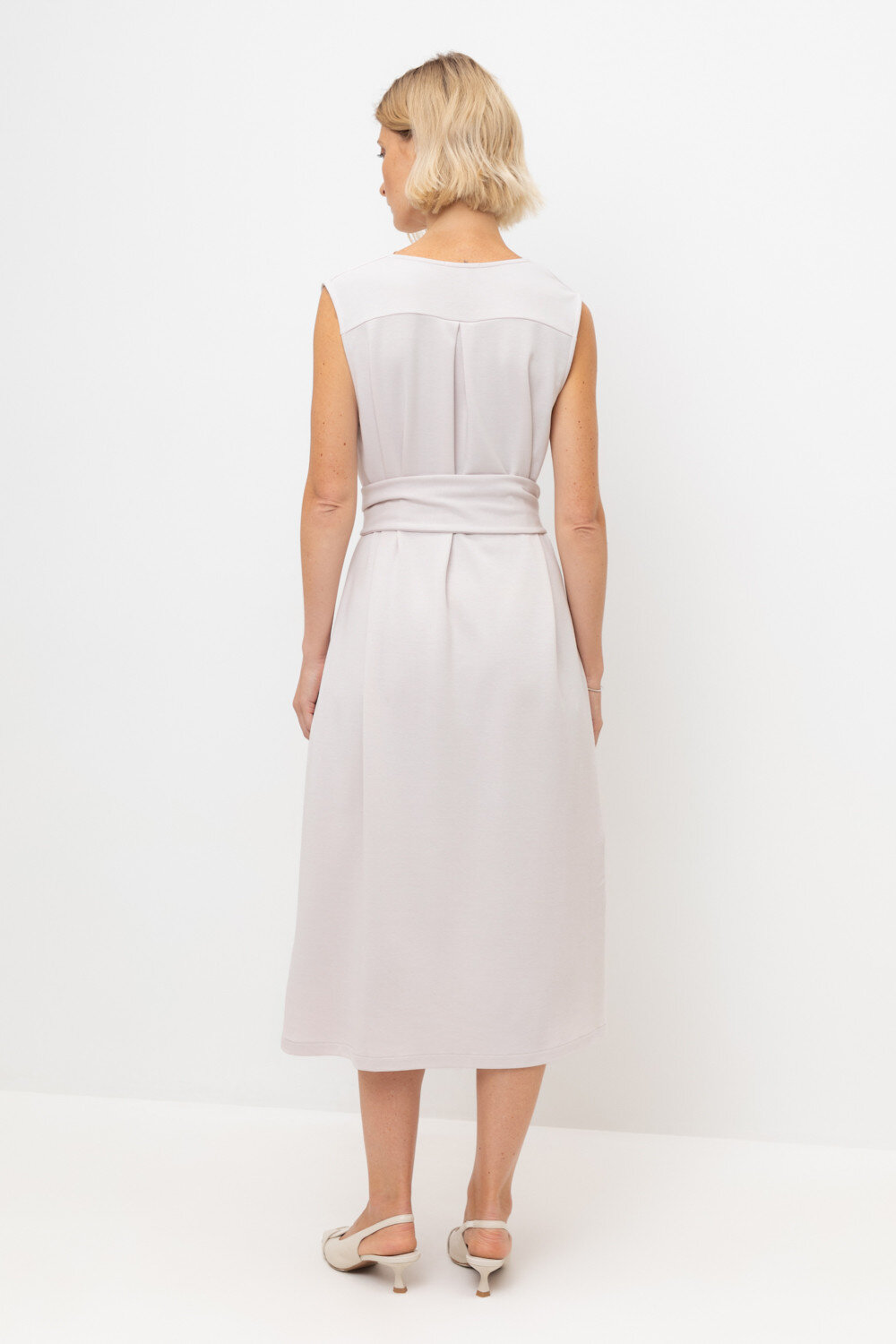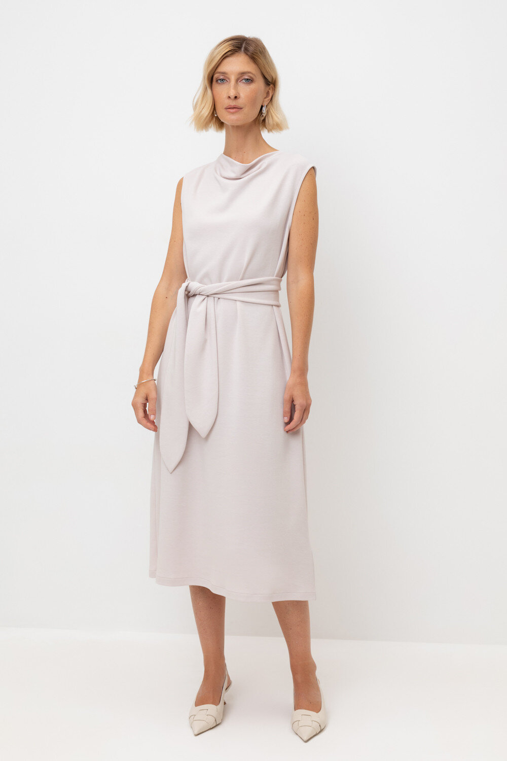 Летнее платье прямого силуэта с драпировкой на уровне декольте, изготовленное из премиального трикотажа DOUBLE FACE, дарит ощущение комфорта и легкости. Широкий трикотажный пояс поможет создать приталенный силуэт. Серо-сиреневый цвет - это нежный оттенок, который придает образу романтичный стиль.