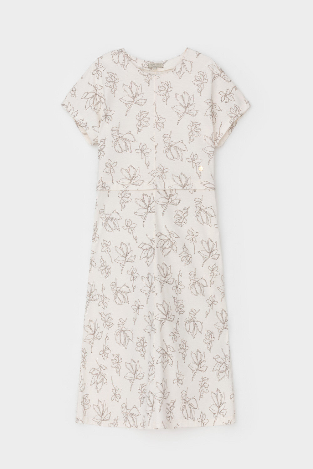Летнее трикотажное платье, изготовленное из 100% хлопка дарит невероятное ощущение комфорта и легкости. Спущенный цельнокроеный рукав в сочетании с нежными магнолиями придает изделию романтический образ.