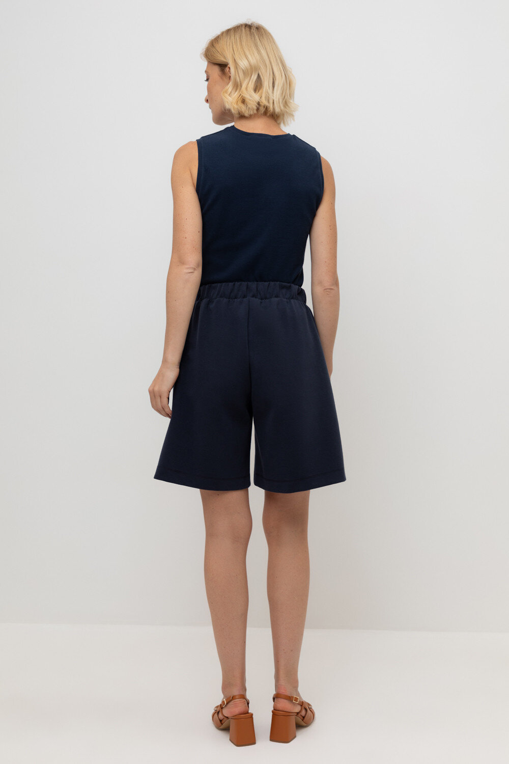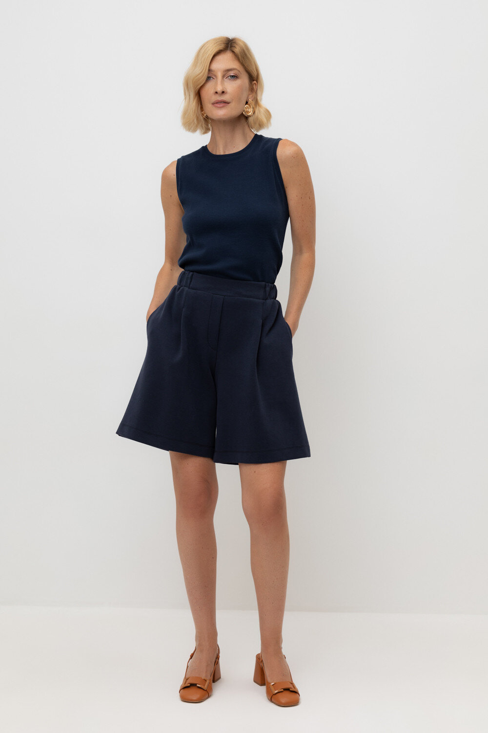 Шорты с защипами и широким трикотажным поясом— это идеальное сочетание элегантности и комфорта. Боковые карманы добавляют функциональности изделию. Изготовлены из премиального трикотажа DOUBLE FACE с добавлением спандекса.
