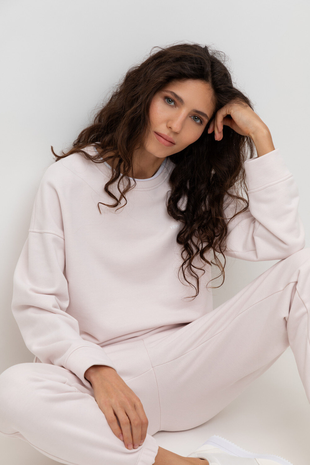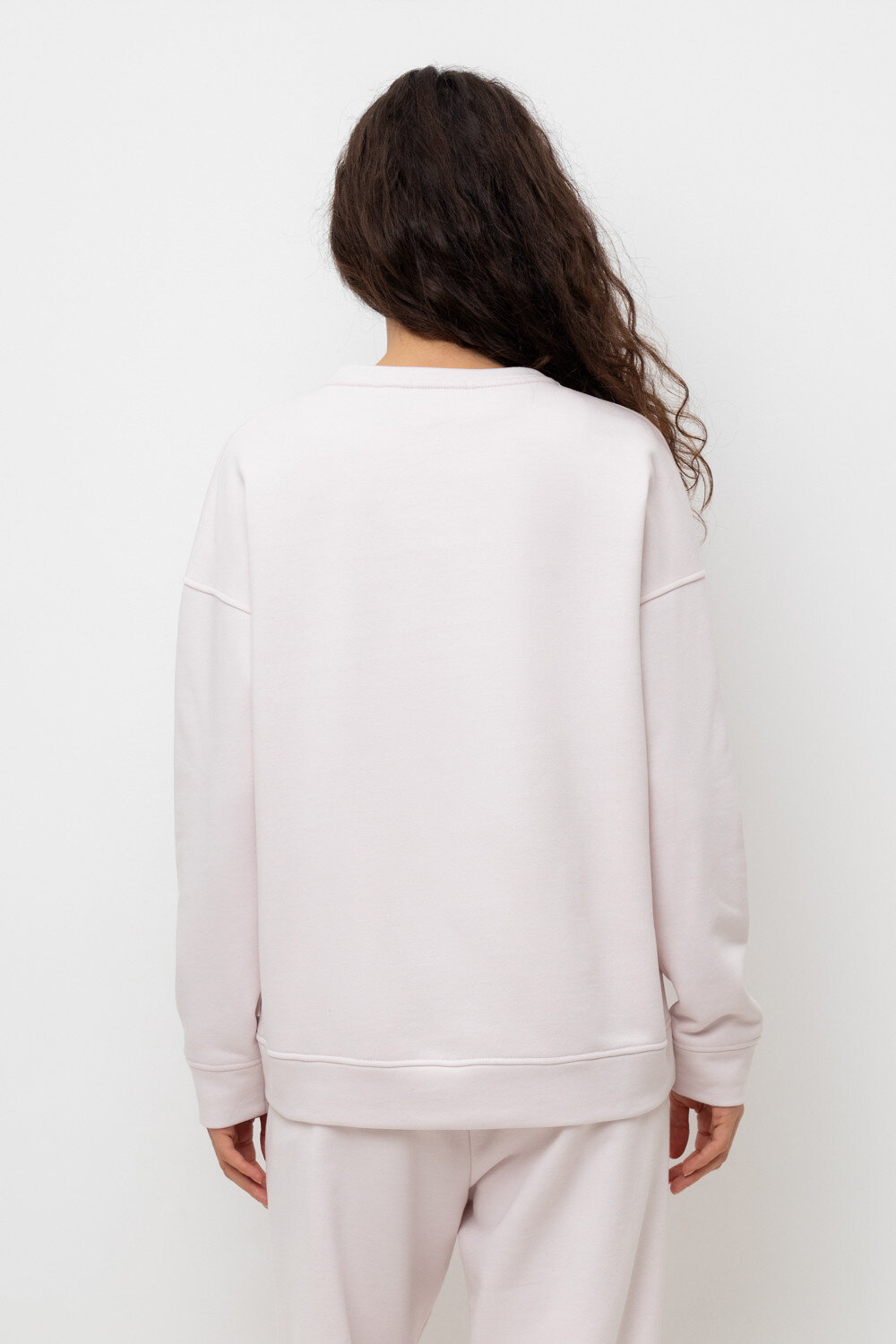Объемный свитшот из двухцветного трикотажного футера. Внутренняя сторона изделия представлена в натуральном цвете хлопка, внешняя в нежно-розовом. За счет использования крашенной пряжи, данный вид полотна прошел минимальную обработку, что придало изделию мягкость и шелковистость.