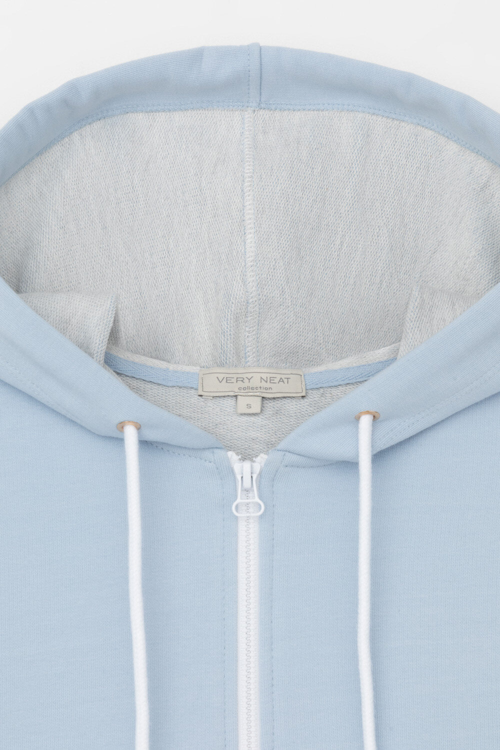 Объемная толстовка из двухцветного трикотажного футера. Внутренняя сторона изделия представлена в натуральном цвете хлопка, внешняя в нежно-голубом. За счет использования крашенной пряжи данный вид полотна прошел минимальную обработку, что придало изделию мягкость и шелковистость.