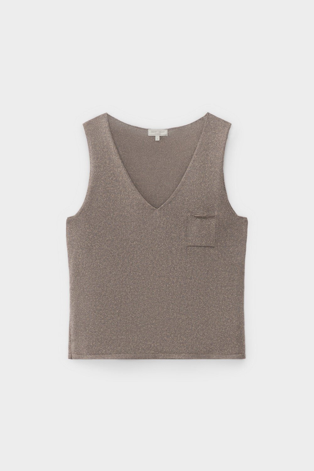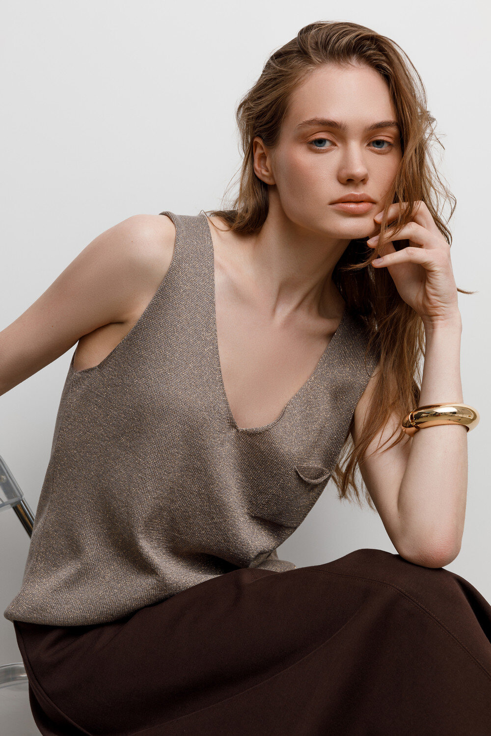 Гладкий топ из итальянской вискозы с метанитом дополнен глубокой линией декольте и аккуратным накладным карманом. Бежевый оттенок, нити метонита, придающие умеренный блеск, позволяют использовать изделие при создании разных образов.