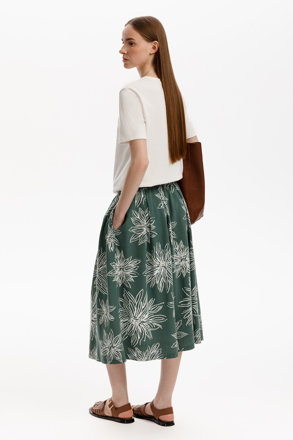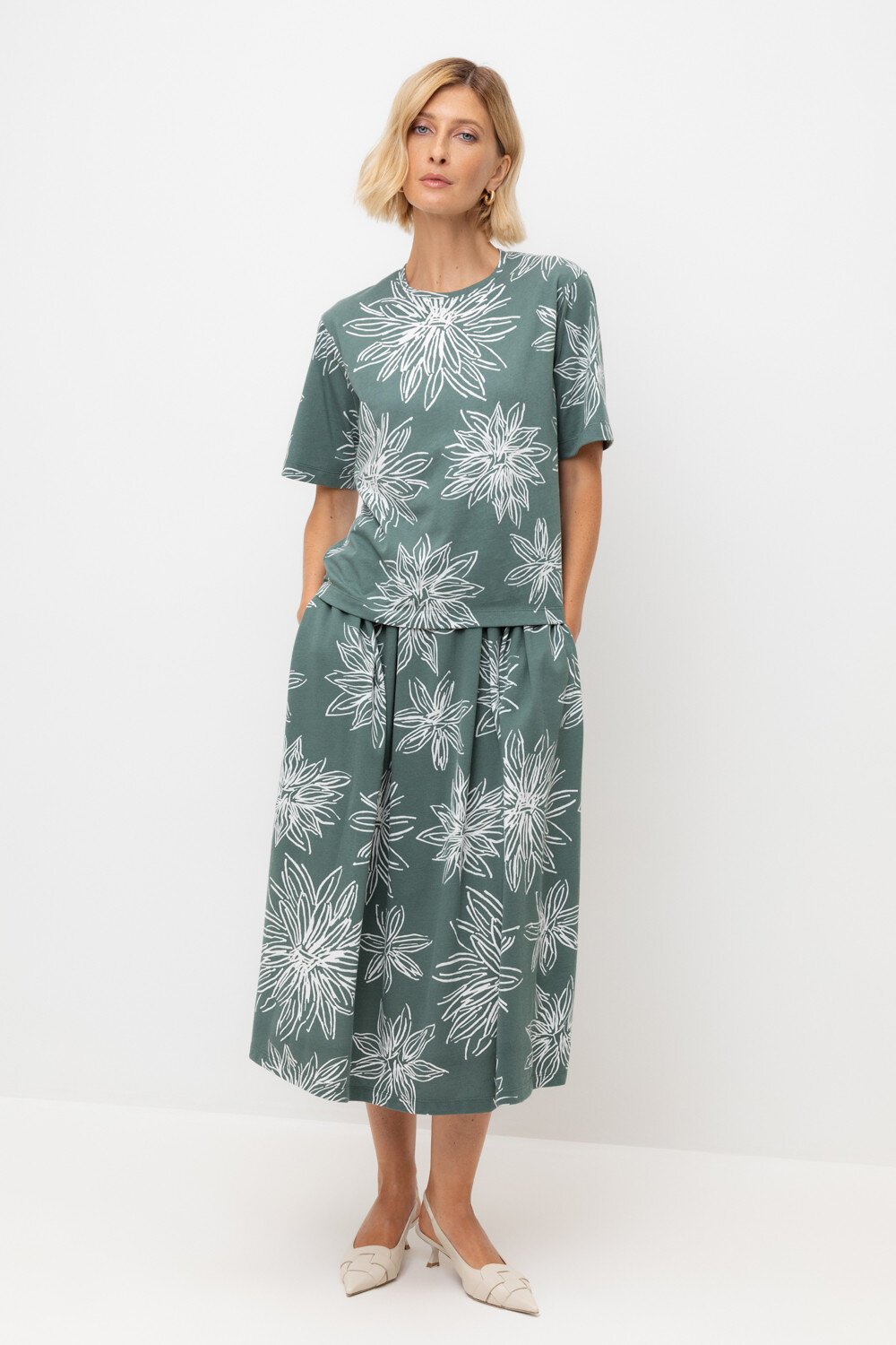 Струящаяся юбка из 100% хлопка пике с небольшой рельефной текстурой дарит ощущение комфорта и легкости. Крупные астры придают изделию летнее настроение.