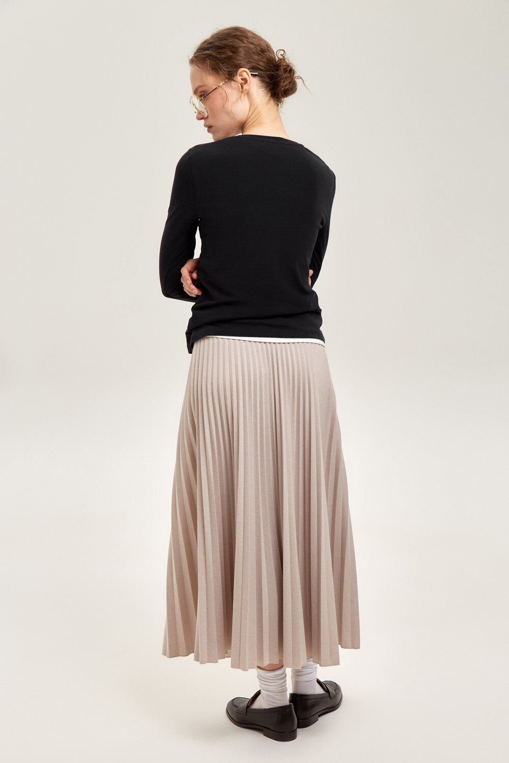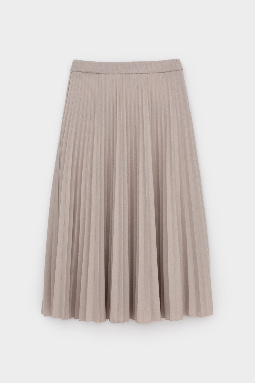 Юбка гофре выполнена из премиального трикотажа DOUBLE FACE. Характеризуется множеством узких складок, создающих объем и подвижность. Серо-бежевый цвет легко комбинируется с другими оттенками в образе.