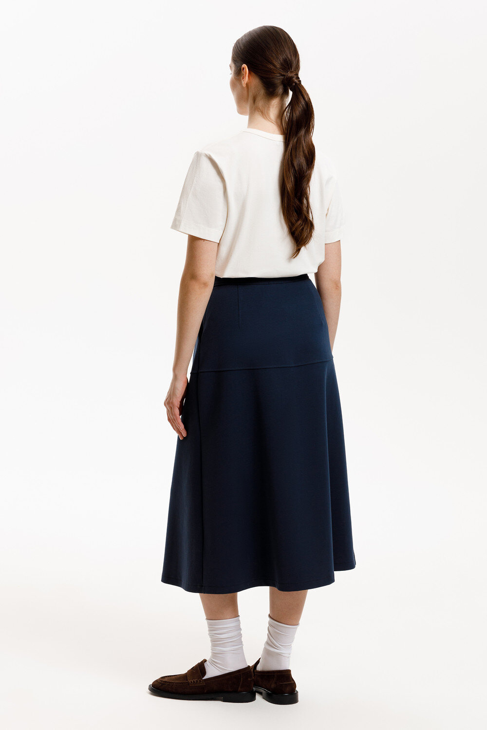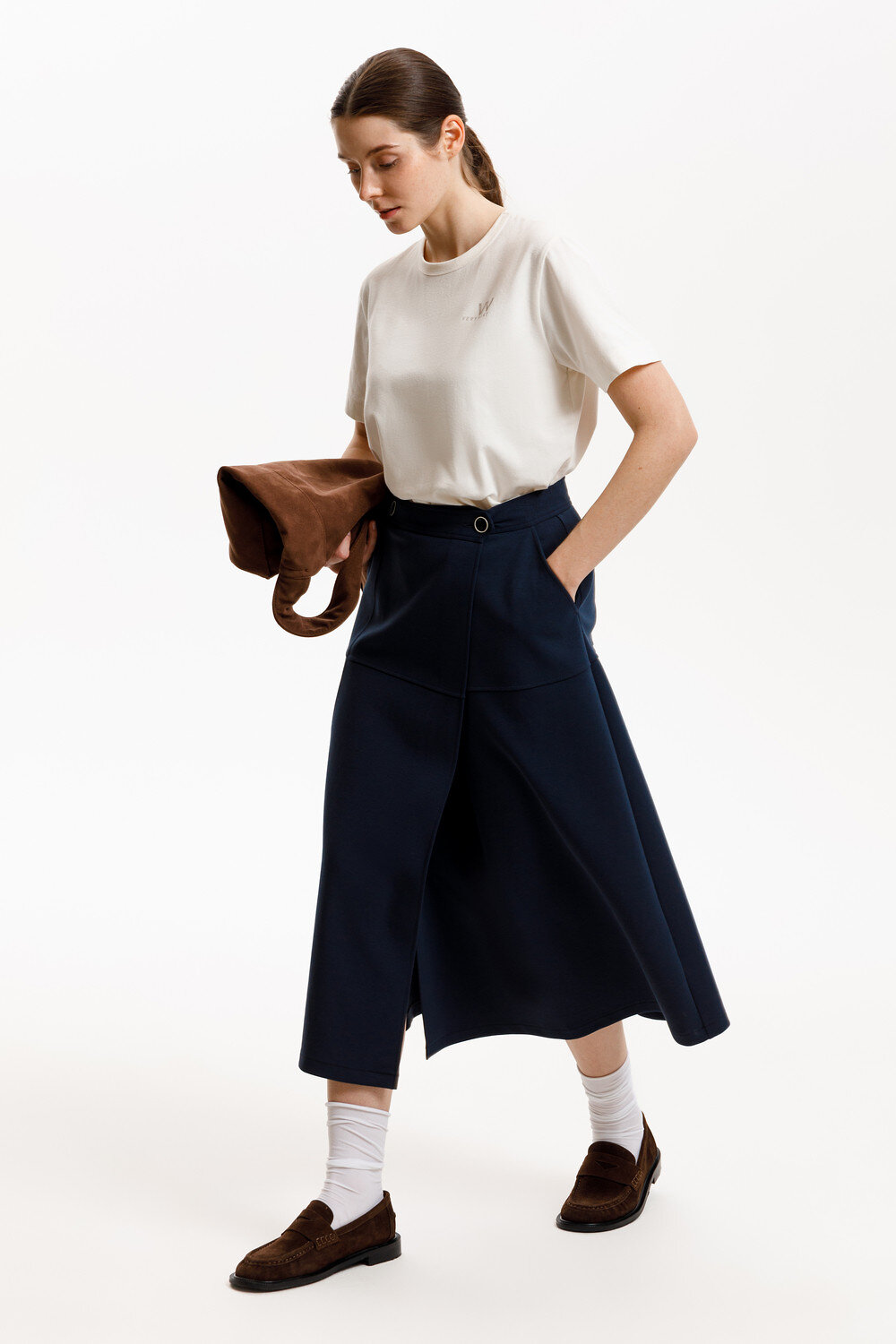 Юбка с акцентной линией талии подчеркивает утонченный силуэт. Длина миди добавляет образу сдержанной классики, делая изделие универсальным для любого случая, а имитации запаха не создает лишний объём. Юбка изготовлена из премиального трикотажа DOUBLE FACE.