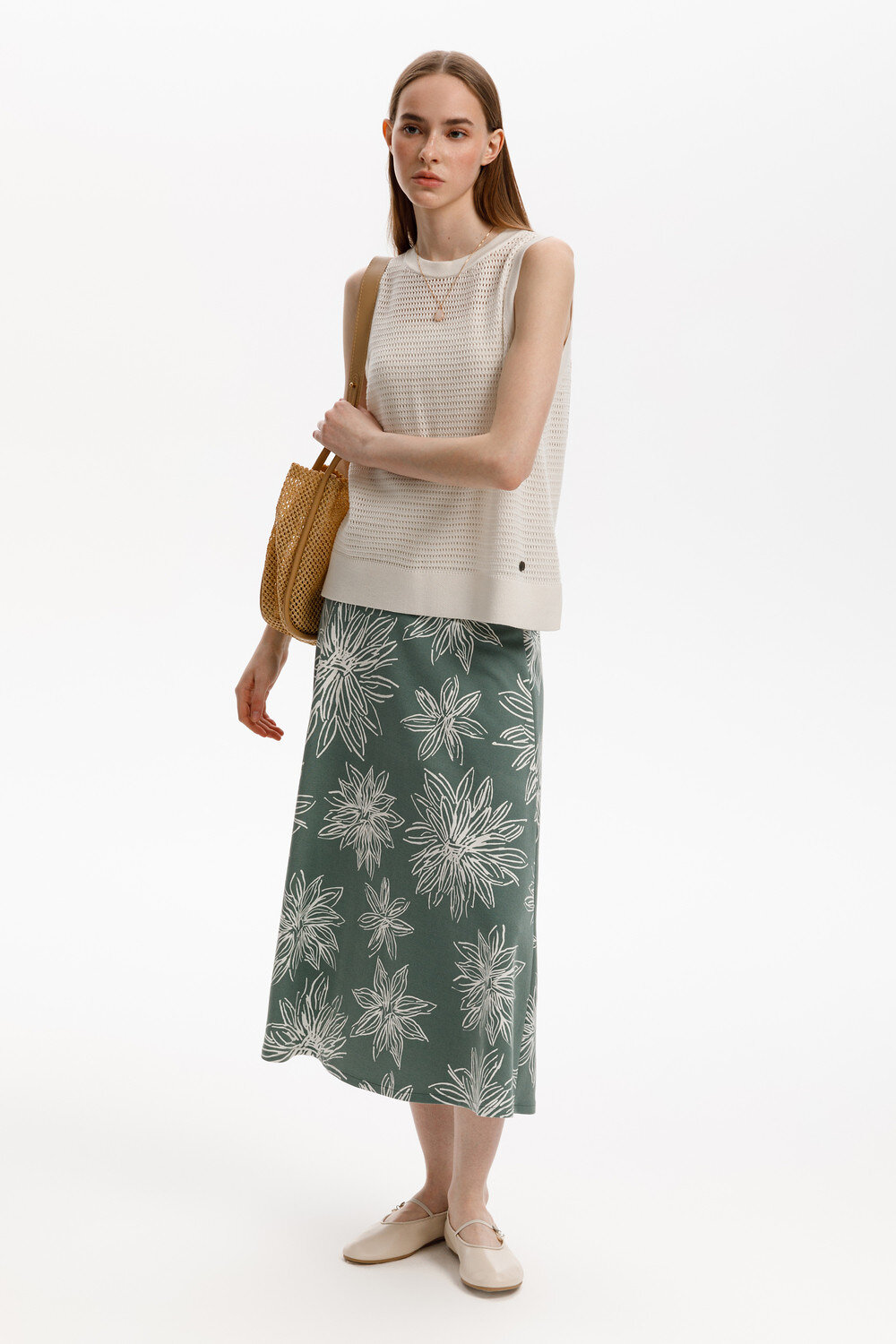Удлиненная юбка расклешенного силуэта, изготовленная из премиального трикотажного полотна DOUBLE FACE. Мягкий на ощупь трикотаж выполнен из высококачественной гребенной пряжи, а его дизайн добавляет летнего настроения. Подберите летний образ, добавив блузу из этой коллекции.
