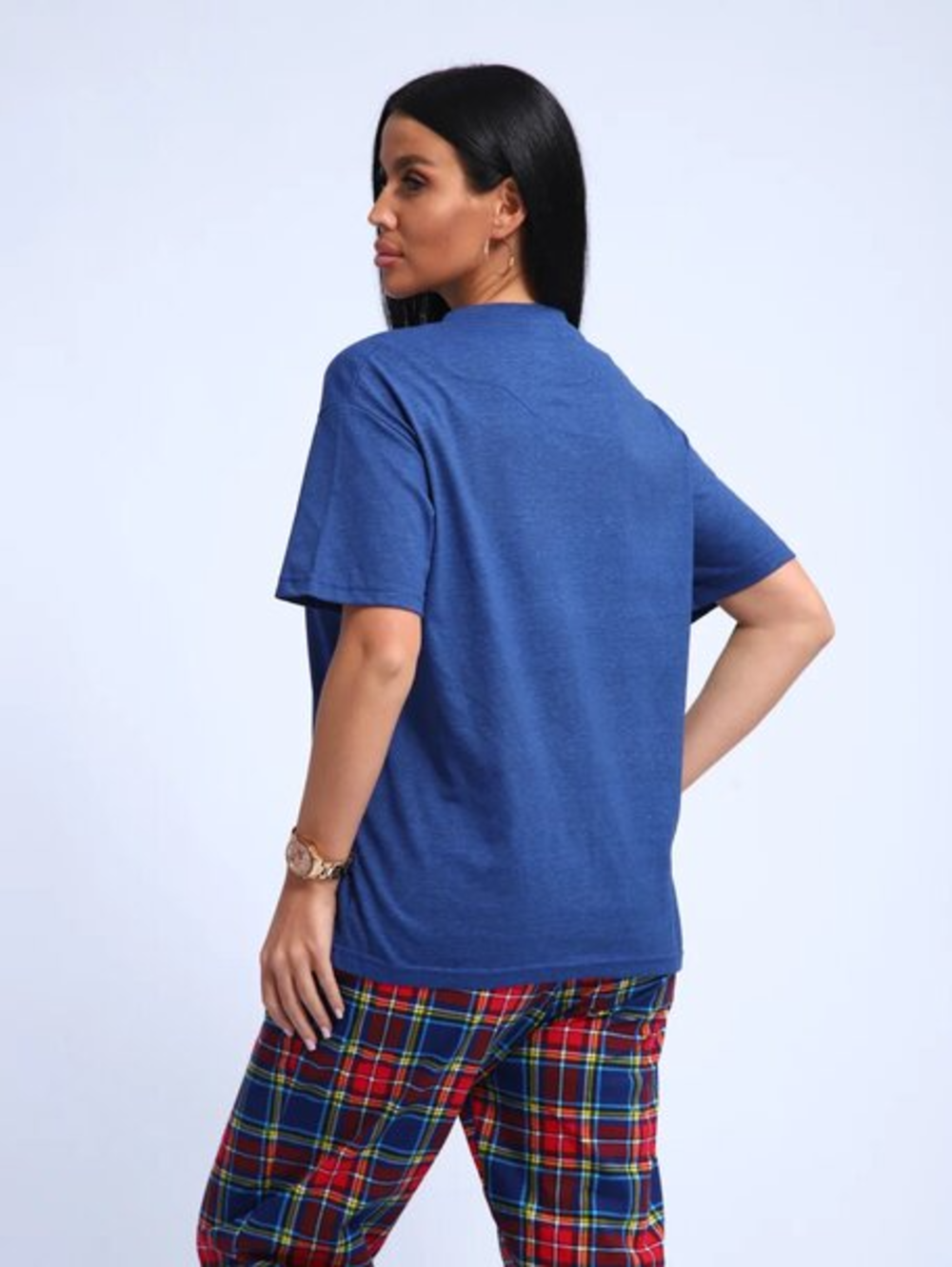 Футболка женская выполнена из трикотажной хлопковой ткани премиум класса. Ткань очень приятна к телу, эластичная и дышащая. Благодаря изумительному крою с коротким рукавом деликатно облагает фигуру, хорошо держит форму, не вытягивается и не скатывается. Цвет: синий; Материал: кулирка; Состав: хлопок 100%.