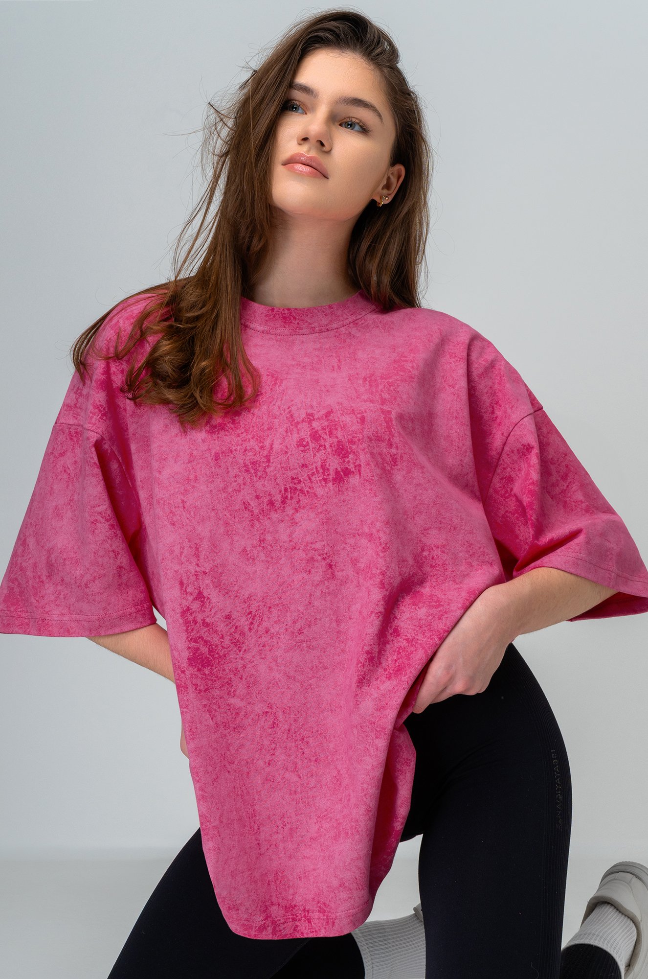 Розовая трикотажная футболка для женщин отлично подойдёт для образов в уличном стиле.