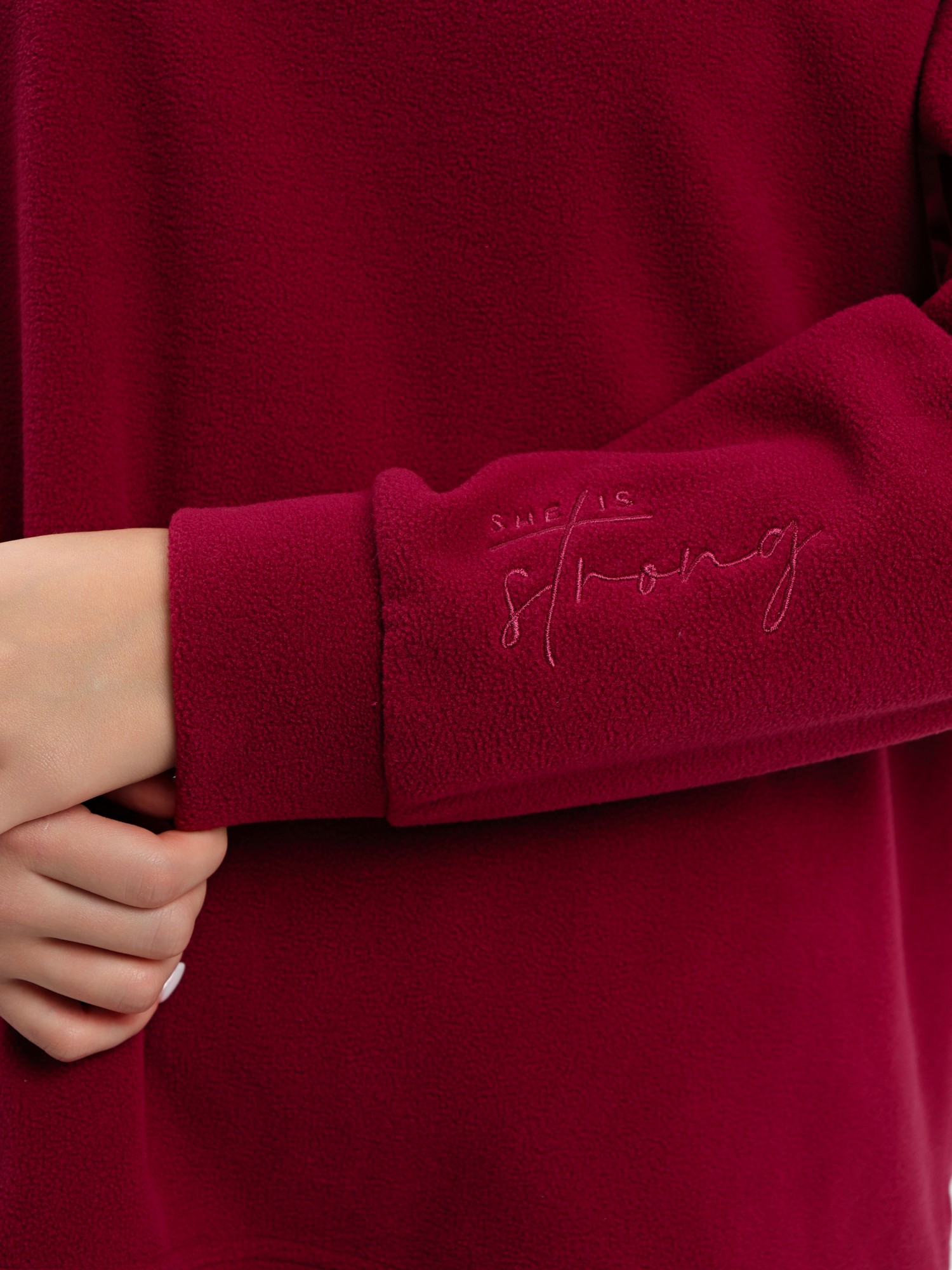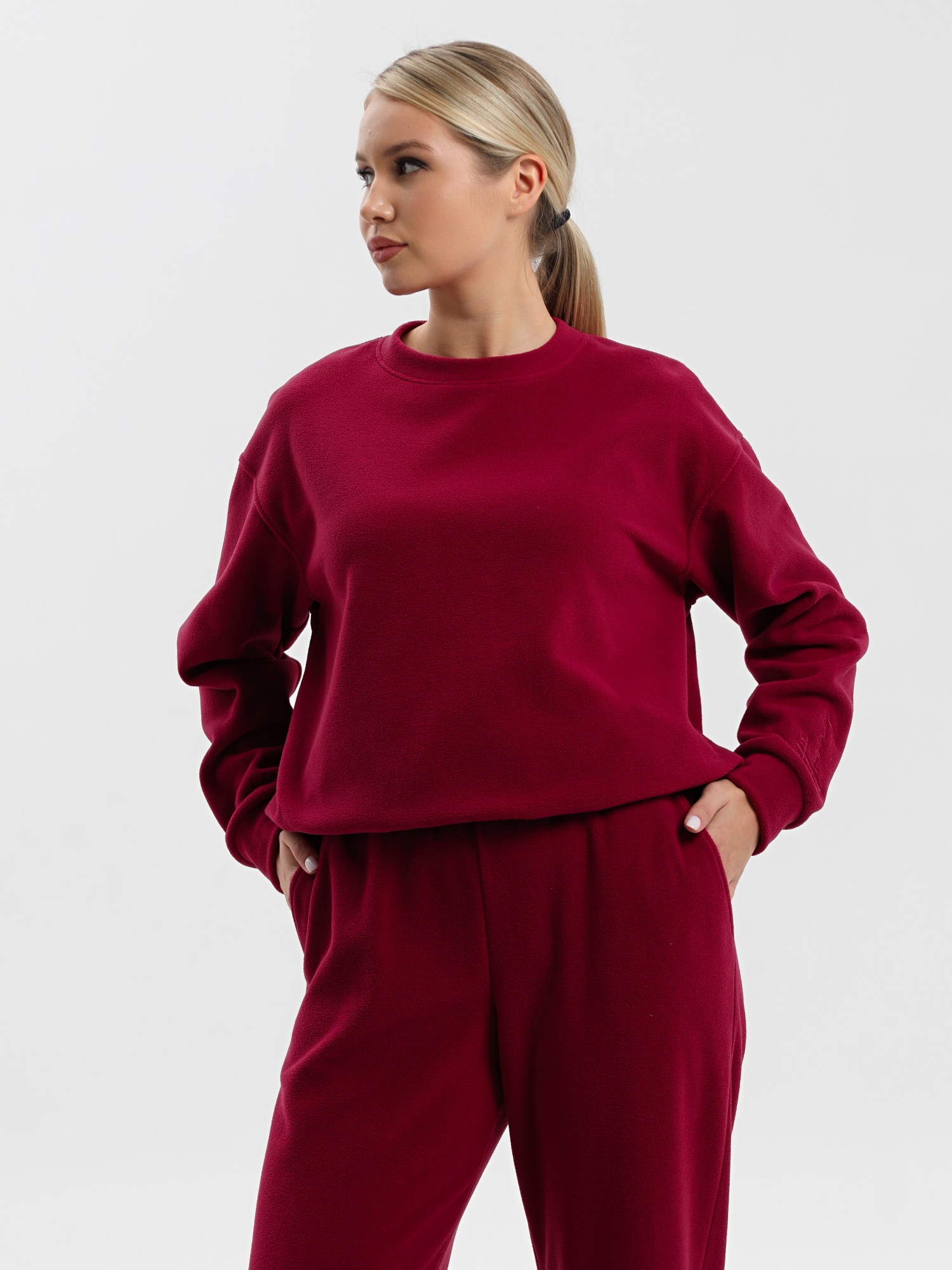 Костюм молодежный из гладкокрашенного полотна «флис», состоящий из джемпера и брюк. Джемпер – прямого силуэта, с длинными втачными рукавами, горловиной овальной формы, обработанной втачной планкой. На левом рукаве выполнена вышивка, низ обработан манжетами. По низу изделия подгибка с вложением эластичной тесьмы, регулируемой по длине фиксаторами.Брюки – длинные, свободные, на притачном поясе с эластичной тесьмой внутри, карманами в боковых швах. Нижние срезы обработаны подгибкой с вложением эластичной тесьмы, регулируемой фиксаторами.