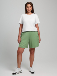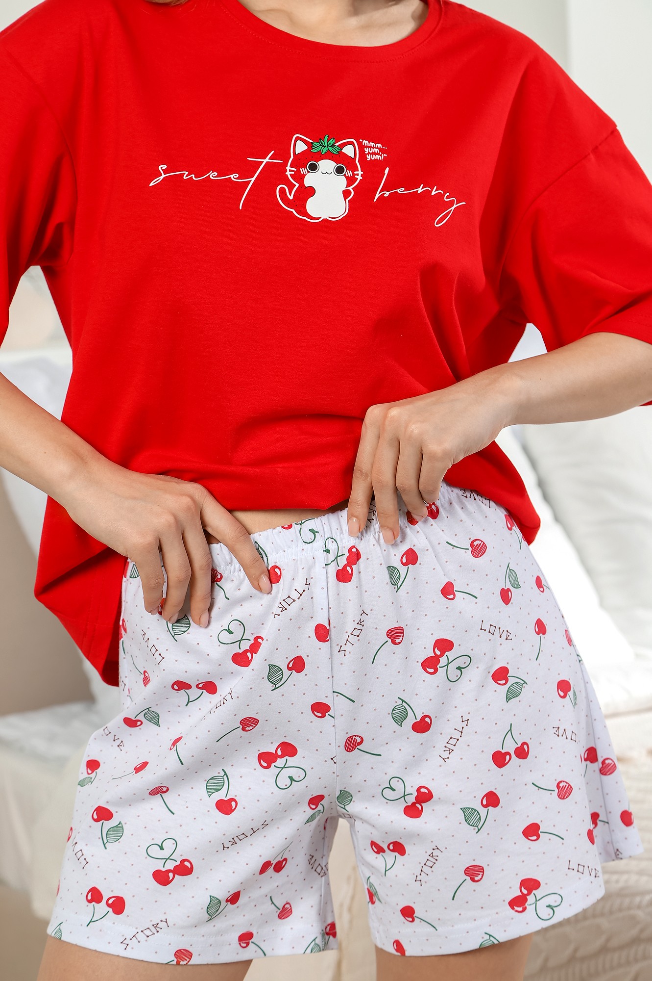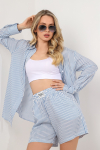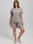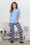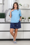 Пижама молодежная из трикотажного полотна «кулирка» в комбинации из двух видов гладкокрашенного и с набивным рисунком, состоящая из футболки и шорт. Футболка – свободного покроя из гладкокрашеного полотна, с короткими втачными рукавами, горловиной овальной формы, обработанной притачной бейкой и принтом на полочке, выполненным в технике «шелкографии».Шорты – из набивного полотна свободного покроя, на притачном поясе с эластичной тесьмой внутри.