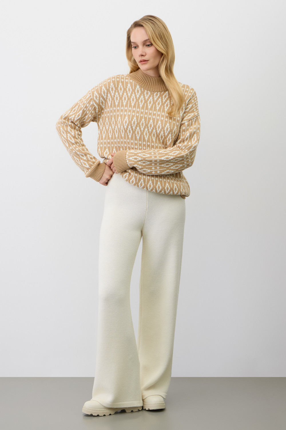 Мягкие брюки из премиальной пряжи, созданные с использованием инновационной технологии смешанного волокна. Уникальная технология производства позволила сформировать воздушную жаккардовую структуру, которая выглядит невероятно изысканно. Деликатное переплетение натуральной шерсти с современным акриловым волокном дарит непревзойденные тактильные ощущения.