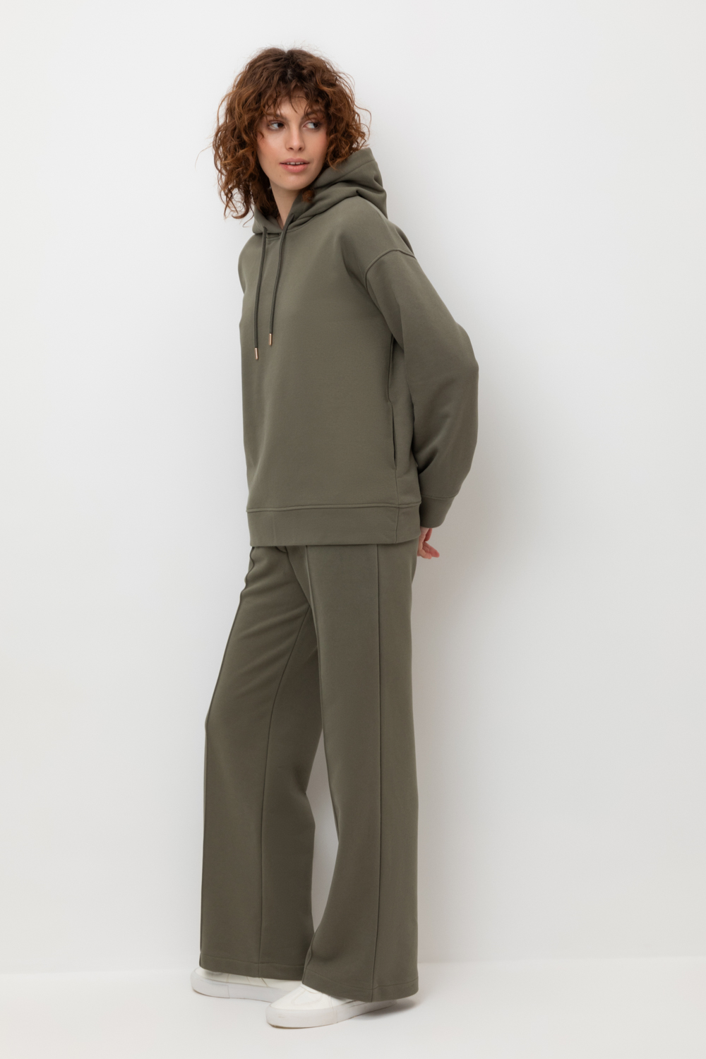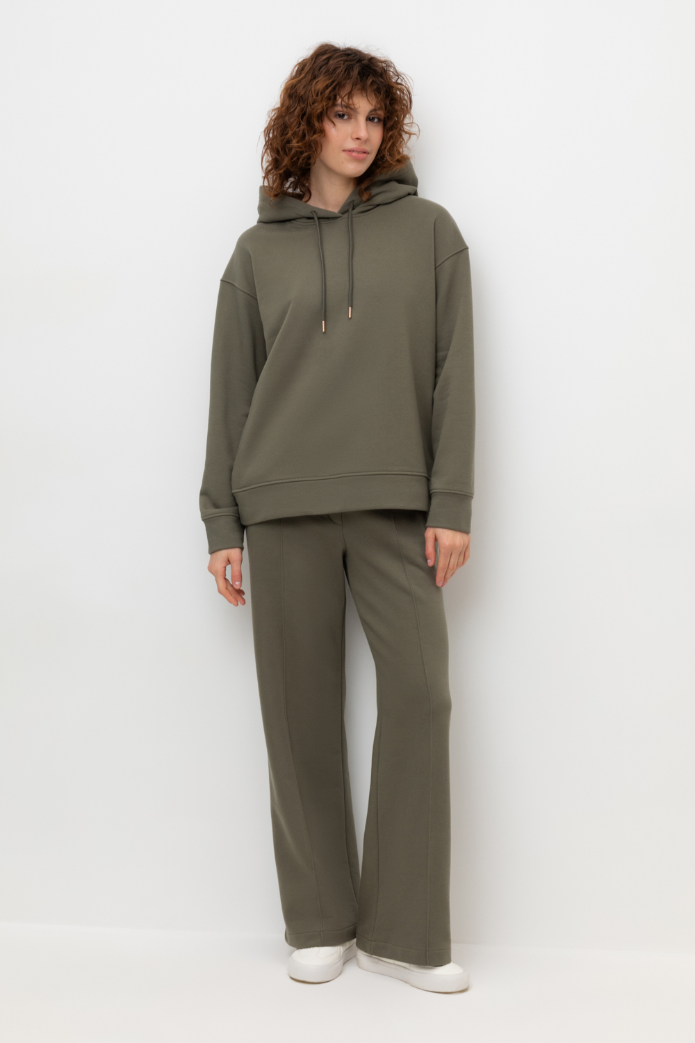 Брюки прямого кроя со стрелкой и боковыми карманами из мягкого петельчатого футера. В составе 80% натурального хлопка и 20% полиэстера, при этом полиэстер ввязан внутрь по особой технологии и не соприкасается с кожей. Пояс со шнурком позволяет регулировать посадку. Идеальный и комфортный вариант на каждый день.