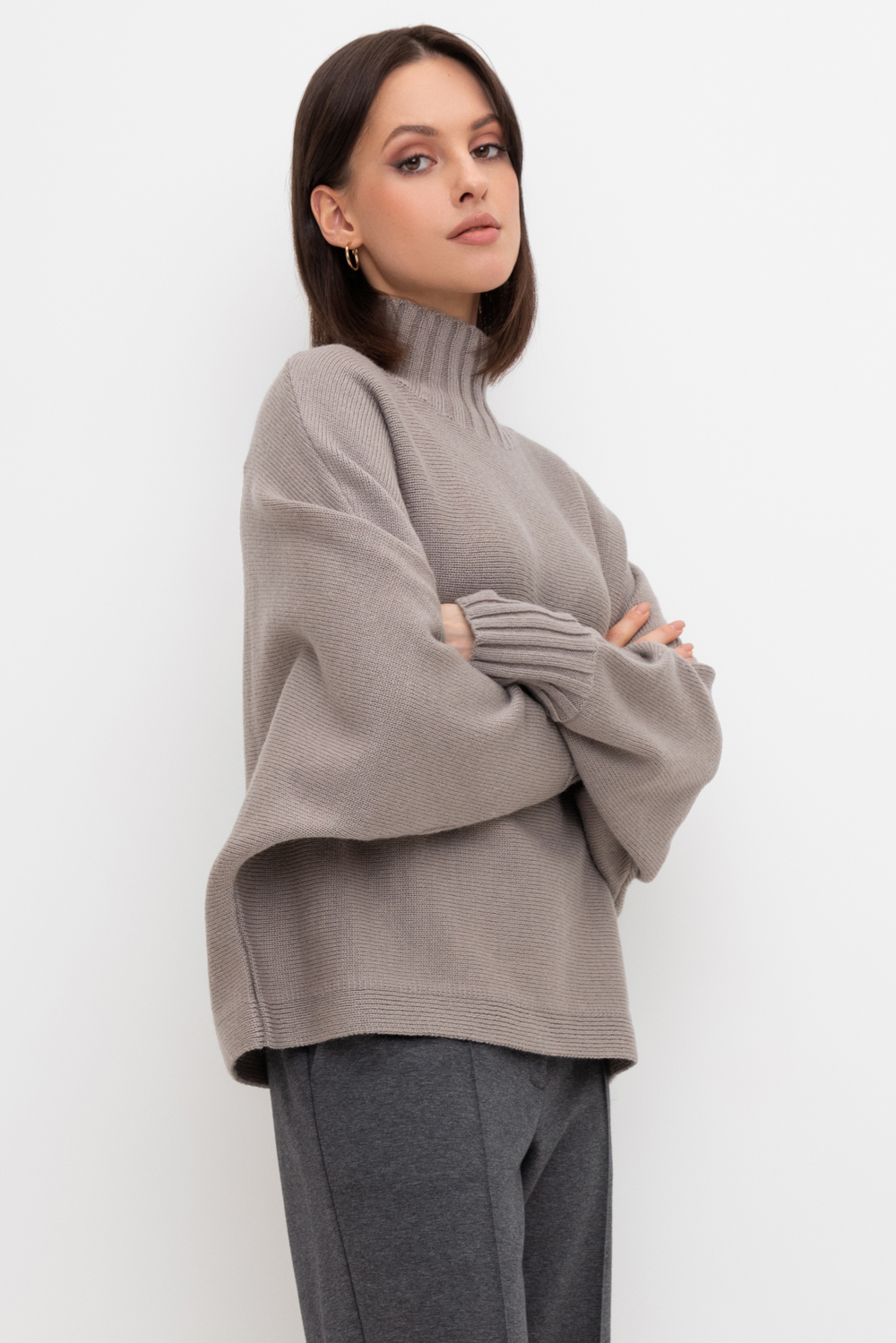Уютный вязаный джемпер с воротником-стойкой из полушерстяной пряжи. Шерсть в составе сохраняет тепло, а волокна акрила добавляют мягкость и объем. Выполнен гладью. Комфортная длинные цельнокроеные рукава придают изделию объем.