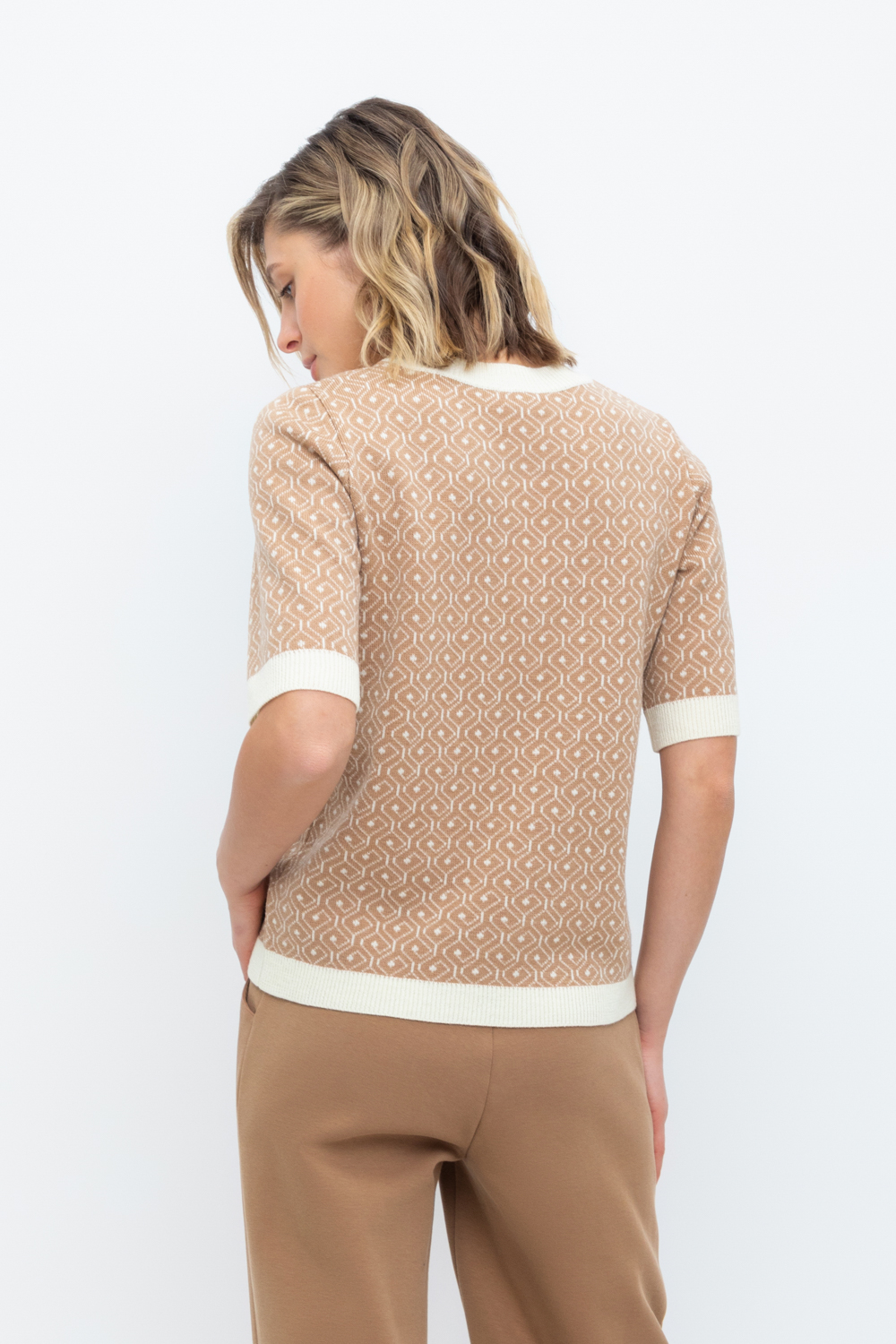 Джемпер в стиле прямой футболки с короткими рукавами. Прямой силуэт, стандартная длина. Выполнен жаккардом из мягкой полушерстяной пряжи. Шерсть мериноса в составе сохраняет тепло, а благодаря волокнам акрила изделие мягкое и дольше сохраняет форму.