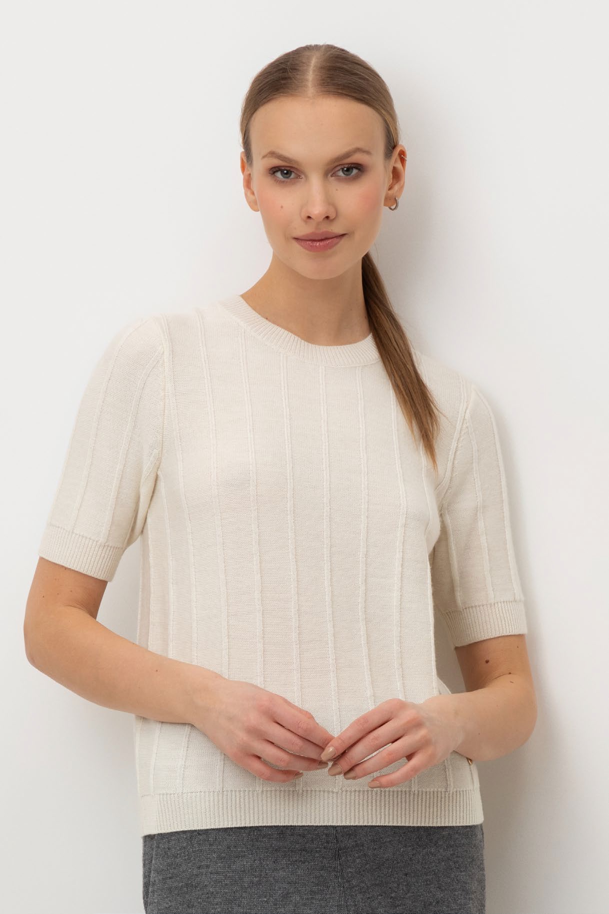 Короткий рукав и рельефная текстура придают джемперу современный вид, идеально сочетающийся с различными стилями одежды.
