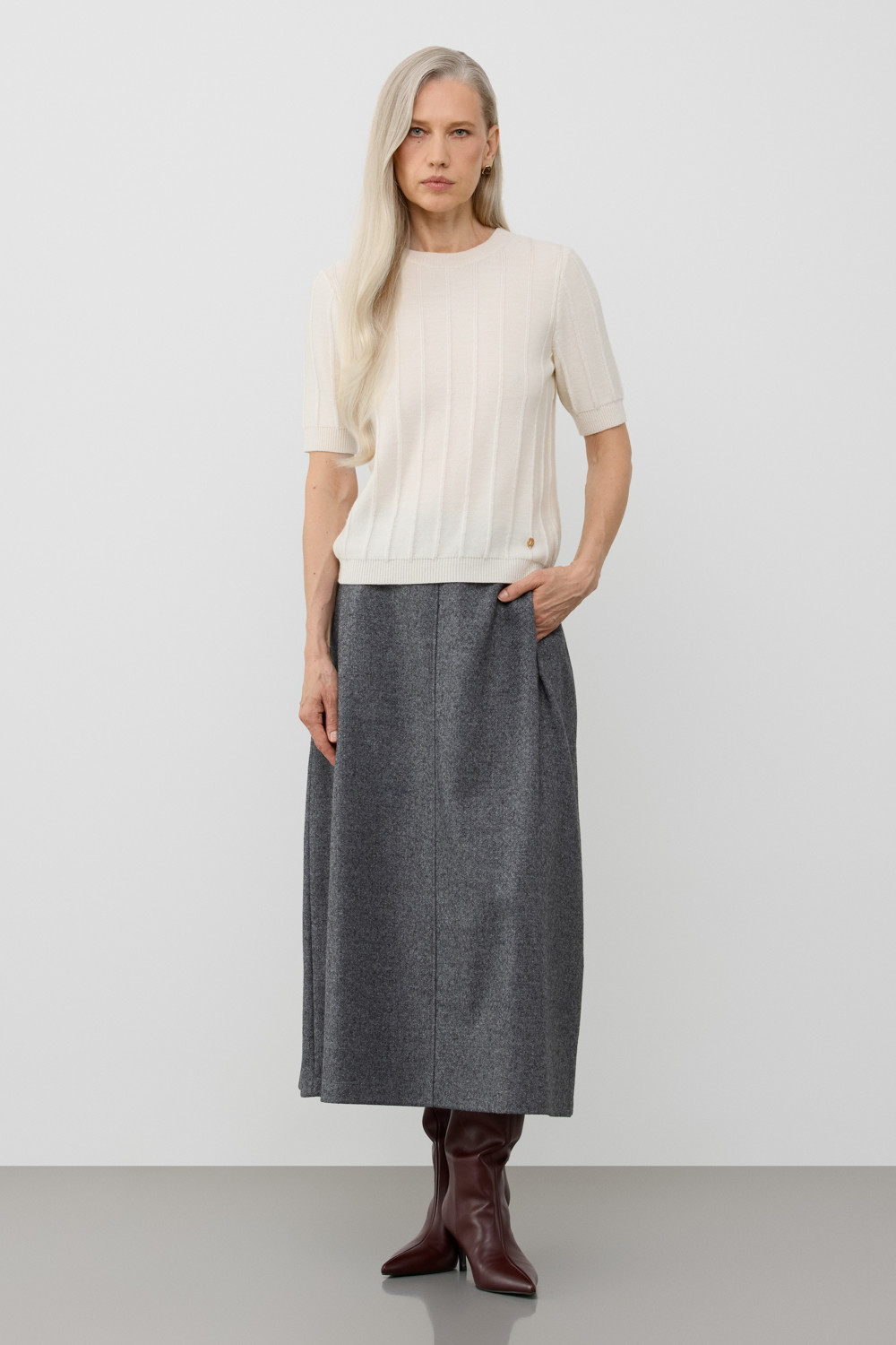 Джемпер из австралийской мериносовой шерсти. Этот материал известен своей исключительной мягкостью и терморегулирующими свойствами, обеспечивая тепло в холодное время года.