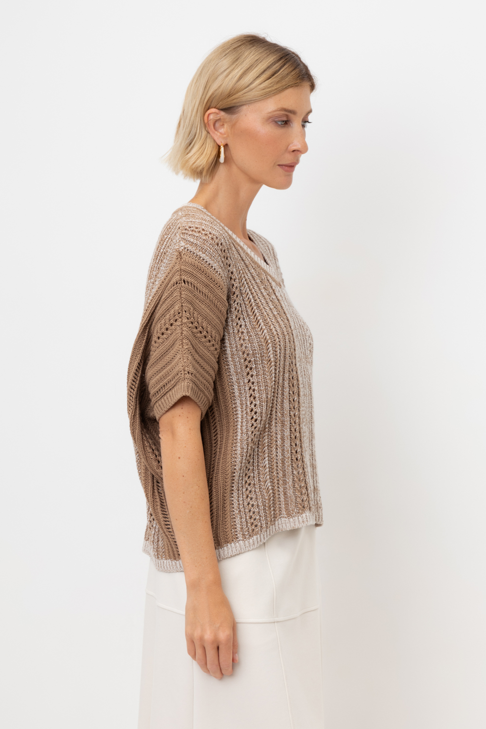 Мягкий джемпер из итальянкой пряжи уникален за счет переплетения молочных и кофейных нитей, создающих вертикальный градиент. Фактуру изделию придает чередование различных техник вязки.