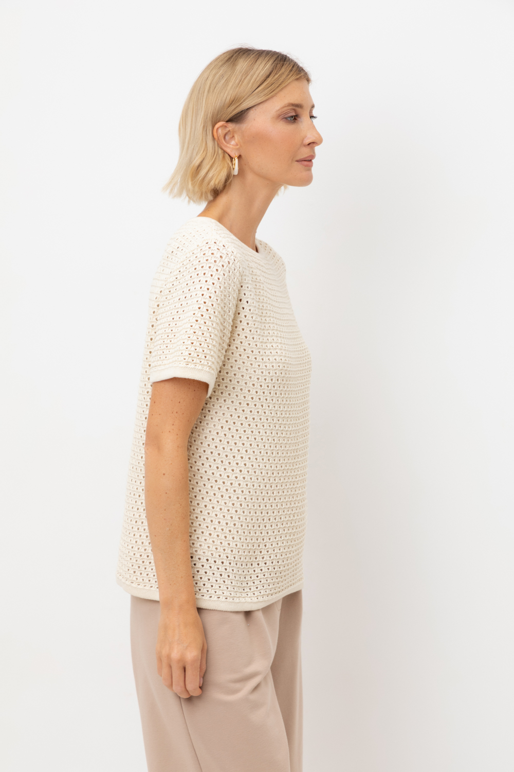 Джемпер с коротким рукавом ажурной вязки из итальянского хлопка. Умеренное переплетение, хлопок в составе придают изделию форму и дают ощущение комфорта во время носки. Незаменим в повседневном летнем гардеробе.