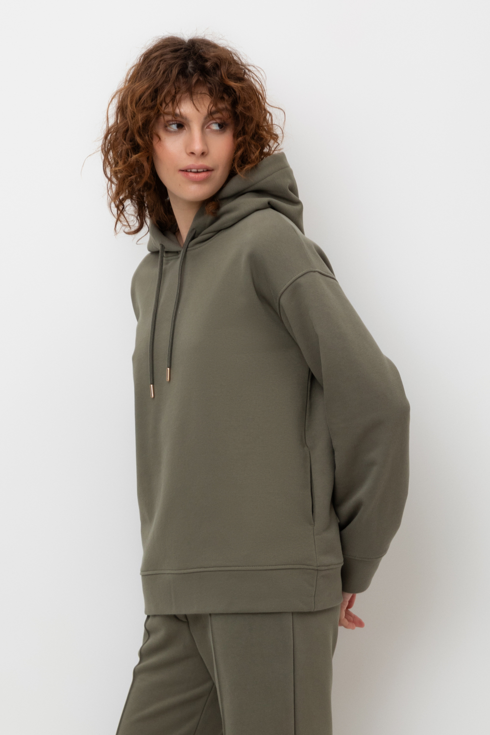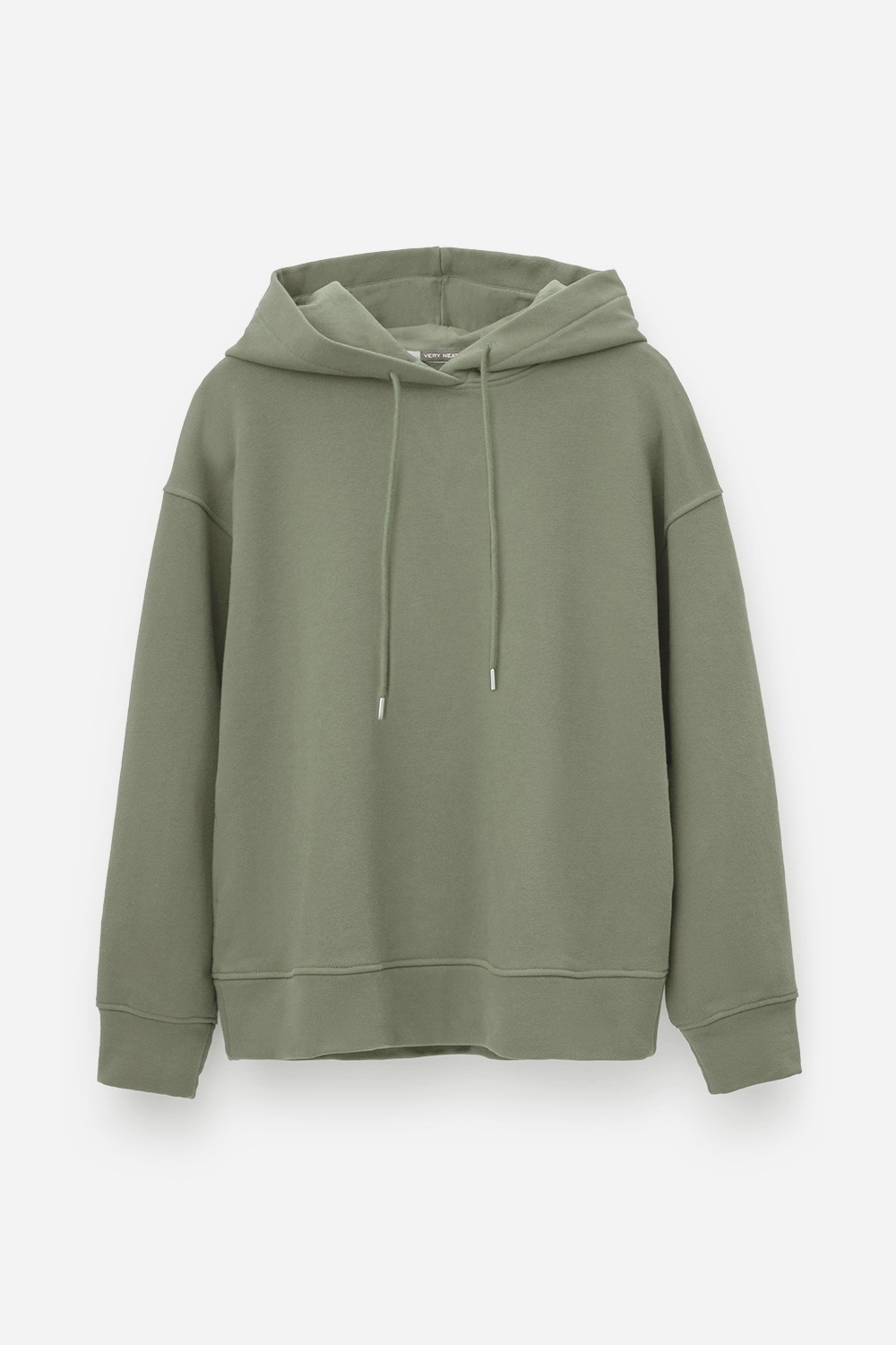 Толстовка с капюшоном и боковыми карманами из петельчатого футера трехнитки. В составе 80% натурального хлопка и 20% полиэстера, при этом полиэстер ввязан внутрь по особой технологии и не соприкасается с кожей. Спущенные рукава, манжеты из основного полотна. Свободный силуэт.