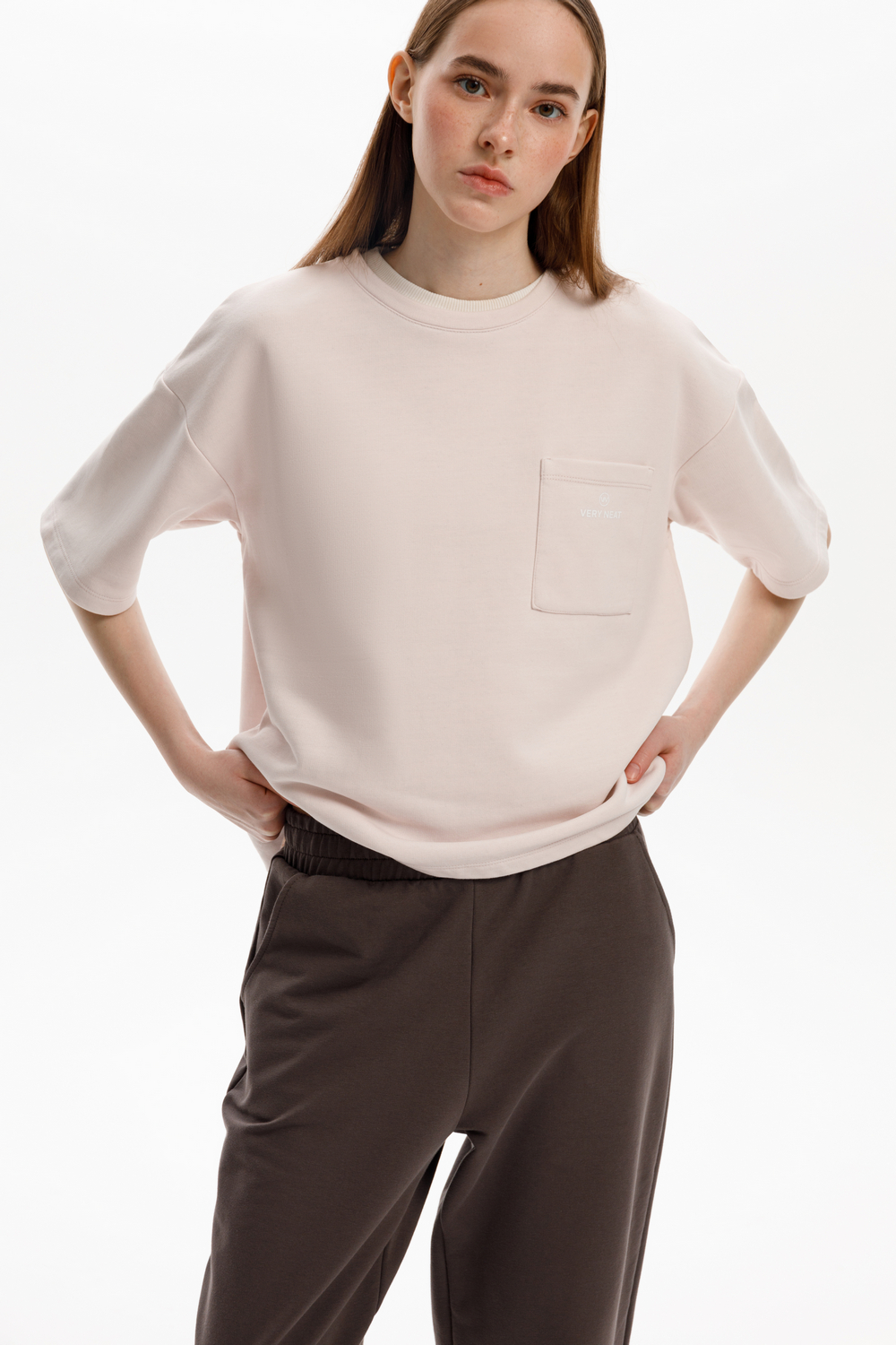 Футболка из мягкого двухцветного футера. Внутренняя сторона изделия представлена в натуральном цвете хлопка, внешняя в нежно-розовом. За счет использования крашенной пряжи, данный вид полотна прошел минимальную обработку, что придало изделию мягкость и шелковистость.