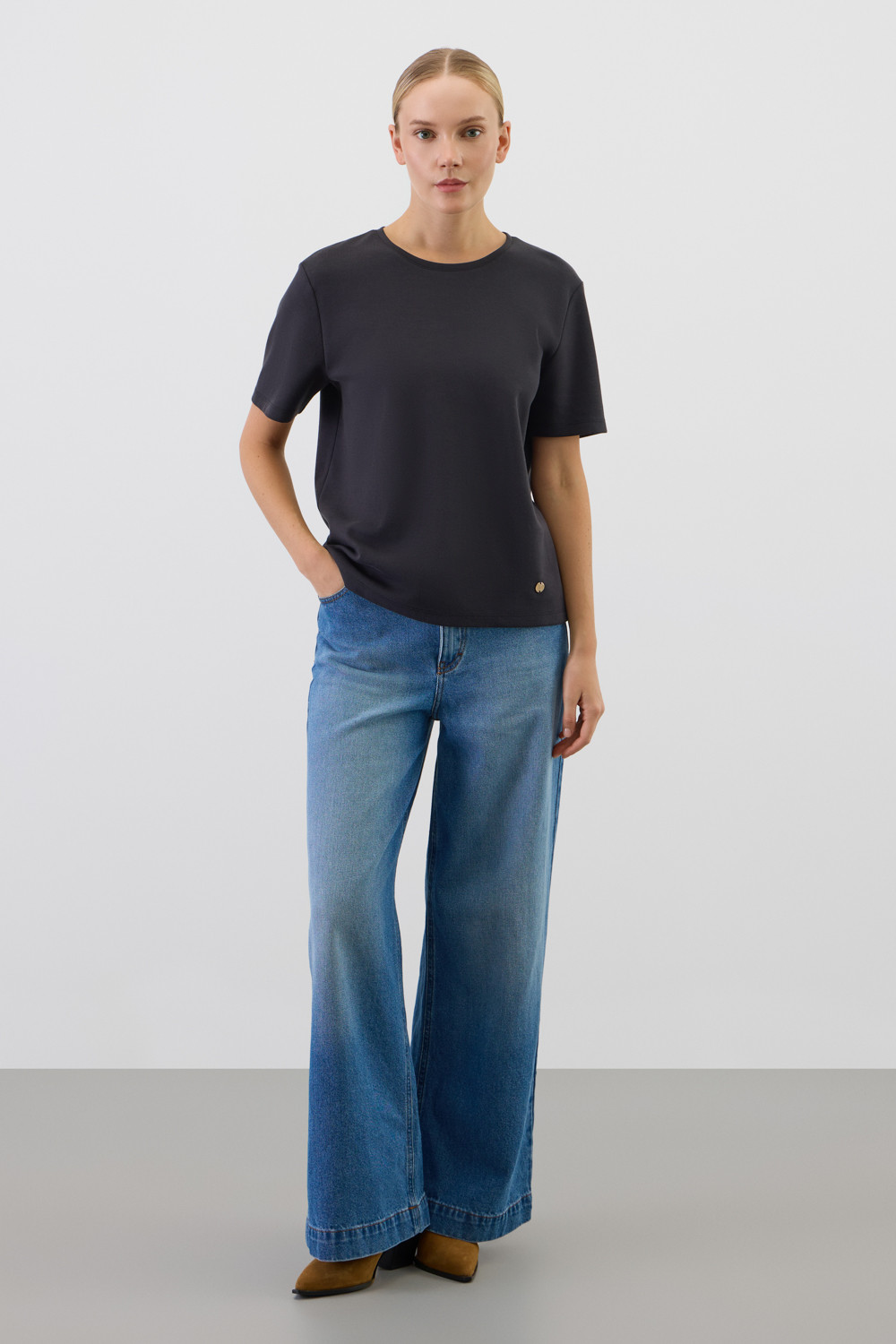 Базовая футболка из премиального трикотажа DOUBLE FACE. Трикотаж прошел специальную каучуковую обработку, что придает ему легкость и шелковистость текстуры. Имеет классический круглый вырез и удобный прямой крой.