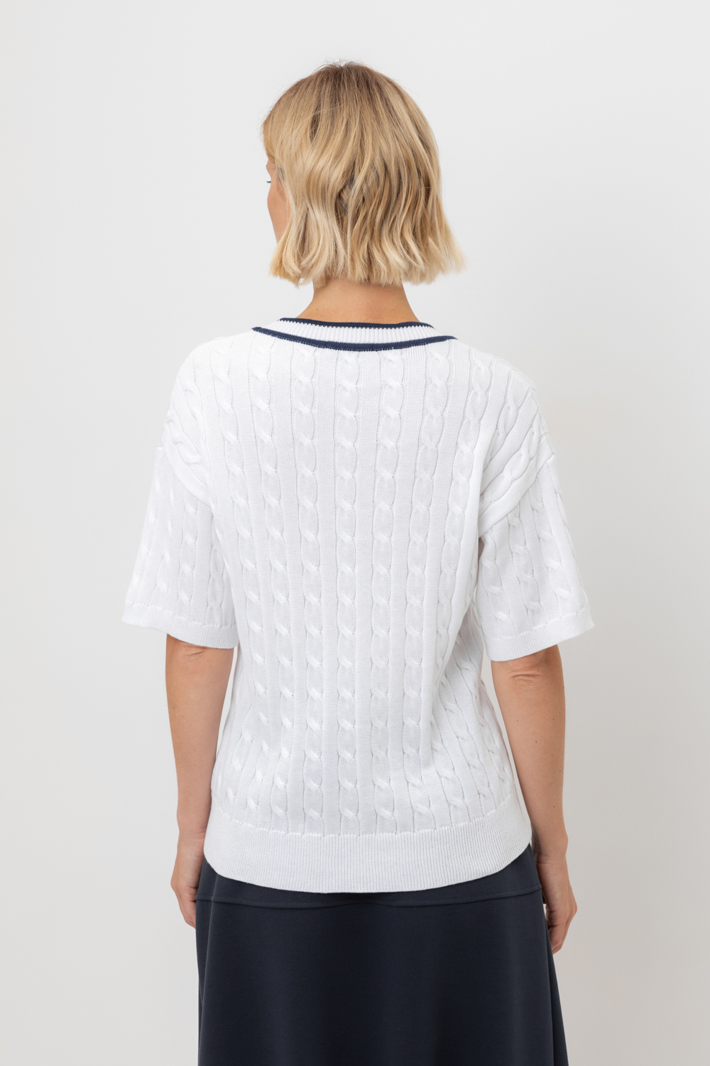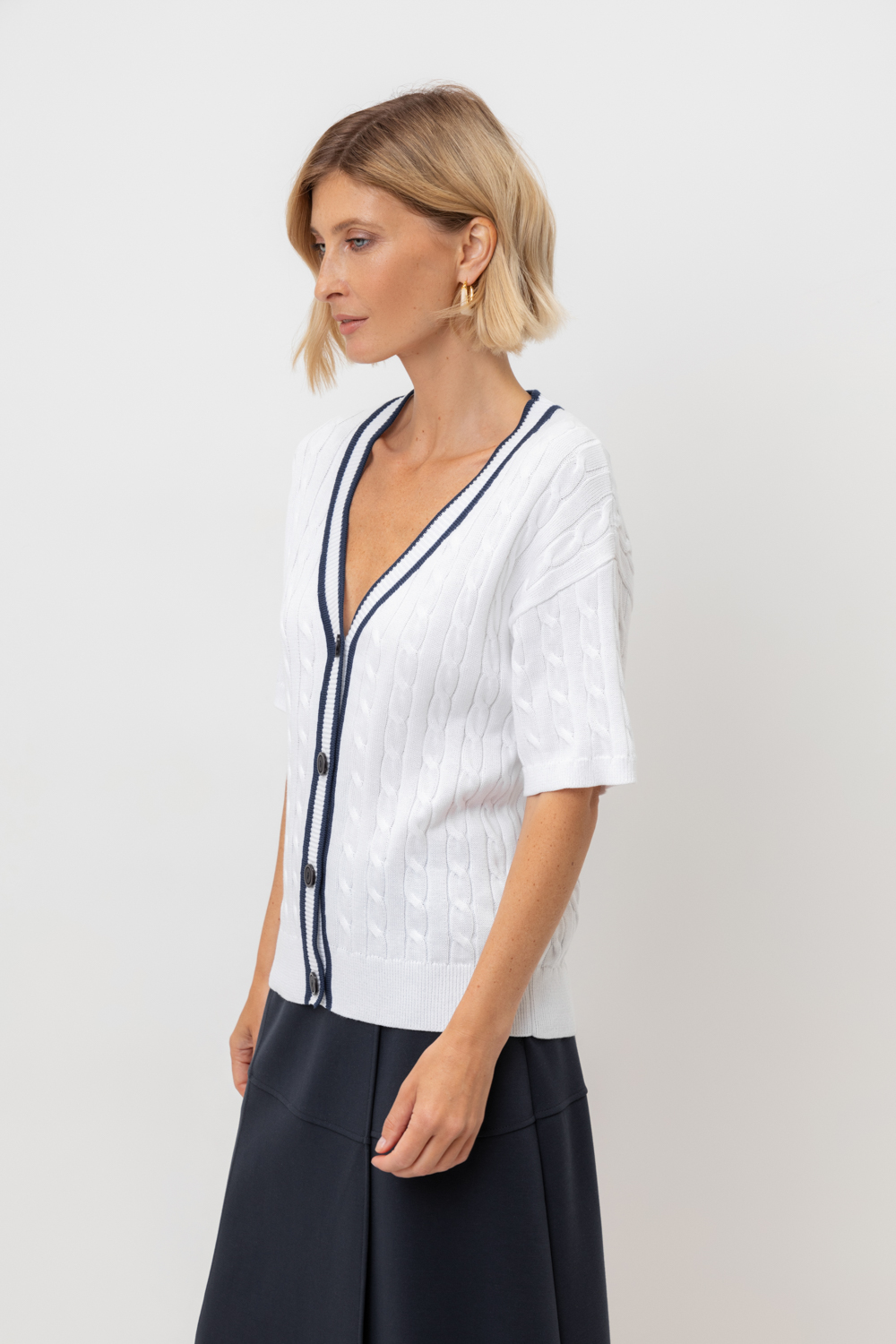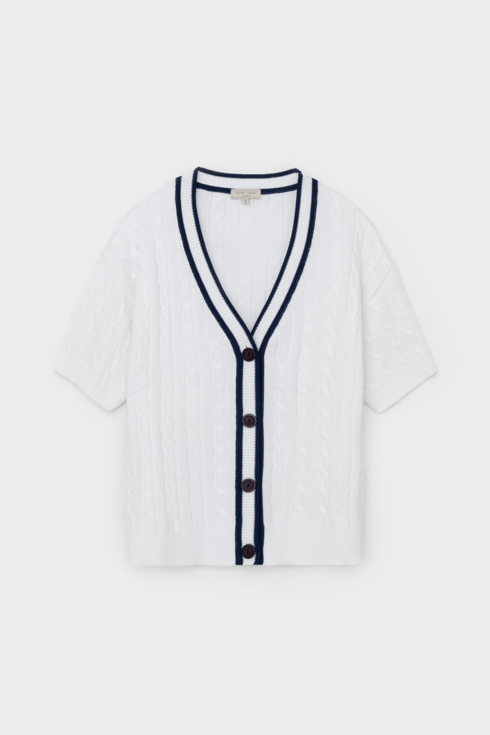 Итальянская хлопковая пряжа белого цвета стала основой для мягкого кардигана. Переплетение в стиле кос, контрастная отделка планки и цвет пуговиц придают изделию классический вид. Хлопок в составе сохраняет форму и дарит ощущение комфорта во время носки.