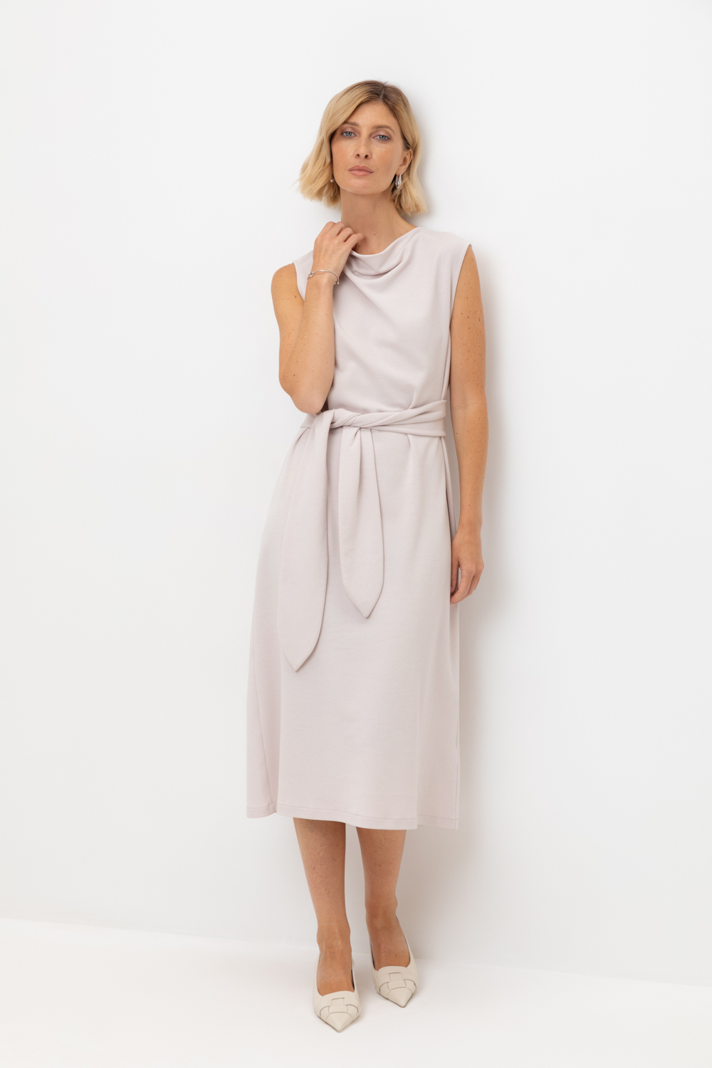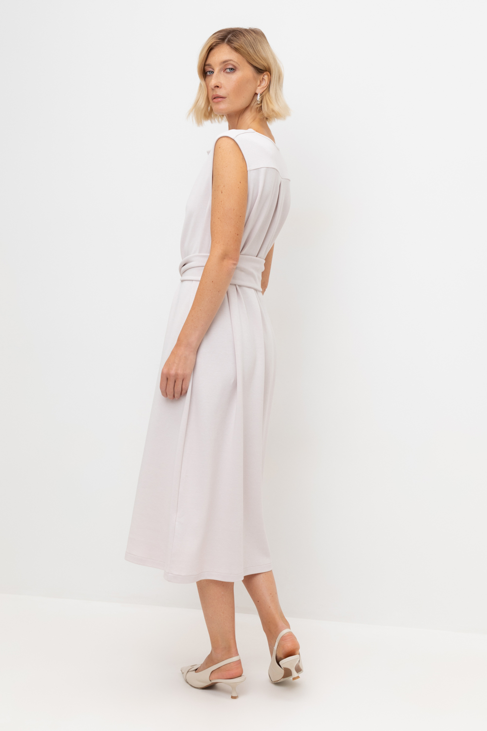 Летнее платье прямого силуэта с драпировкой на уровне декольте, изготовленное из премиального трикотажа DOUBLE FACE, дарит ощущение комфорта и легкости. Широкий трикотажный пояс поможет создать приталенный силуэт. Серо-сиреневый цвет - это нежный оттенок, который придает образу романтичный стиль.