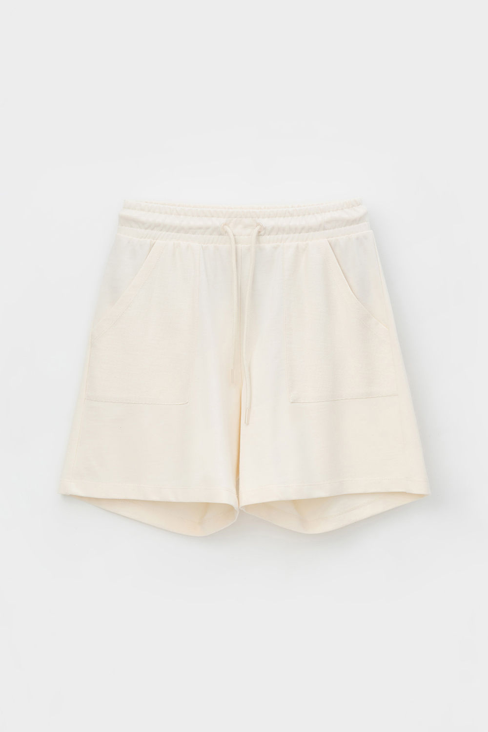 Женские шорты из футера на резинке с удобными карманами наизнанку. Пояс утягивается по ширине круглым шнуром. Низ обработан плоскими швами.