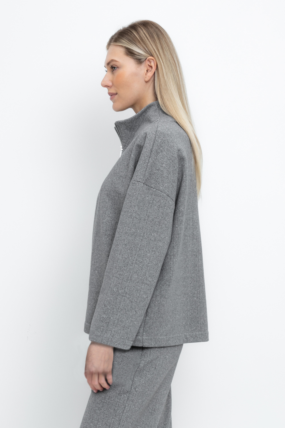 Укороченная трикотажная куртка на молнии с карманами и высоким воротником-стойкой. Произведена из мягкого трикотажного футера трехнитки. Спущенные рукава добавляют объем.