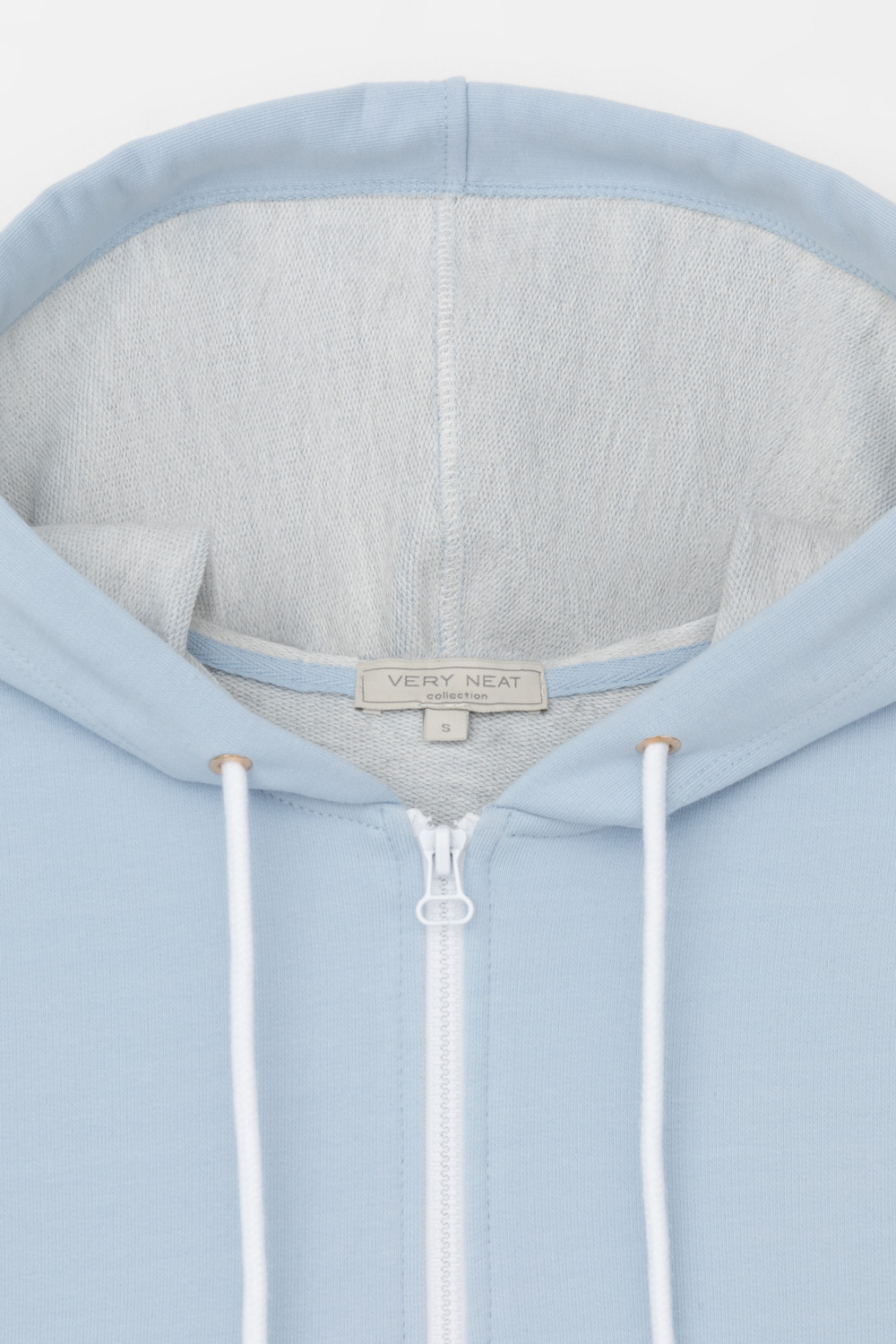 Объемная толстовка из двухцветного трикотажного футера. Внутренняя сторона изделия представлена в натуральном цвете хлопка, внешняя в нежно-голубом. За счет использования крашенной пряжи данный вид полотна прошел минимальную обработку, что придало изделию мягкость и шелковистость.