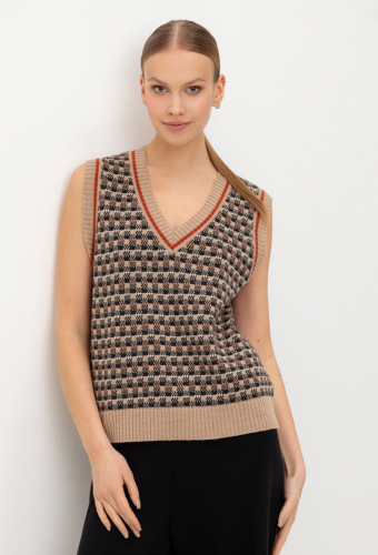 Жилет в кантри-стиле, изготовленный из высококачественной пряжи с применением передовой технологии смешанных волокон. Изысканное сочетание шерсти и акрила создает непревзойденный комфорт: модель деликатно подчеркивает силуэт, обеспечивает нежное прикосновение к коже и сохраняет безупречный внешний вид.
