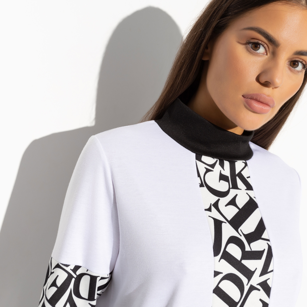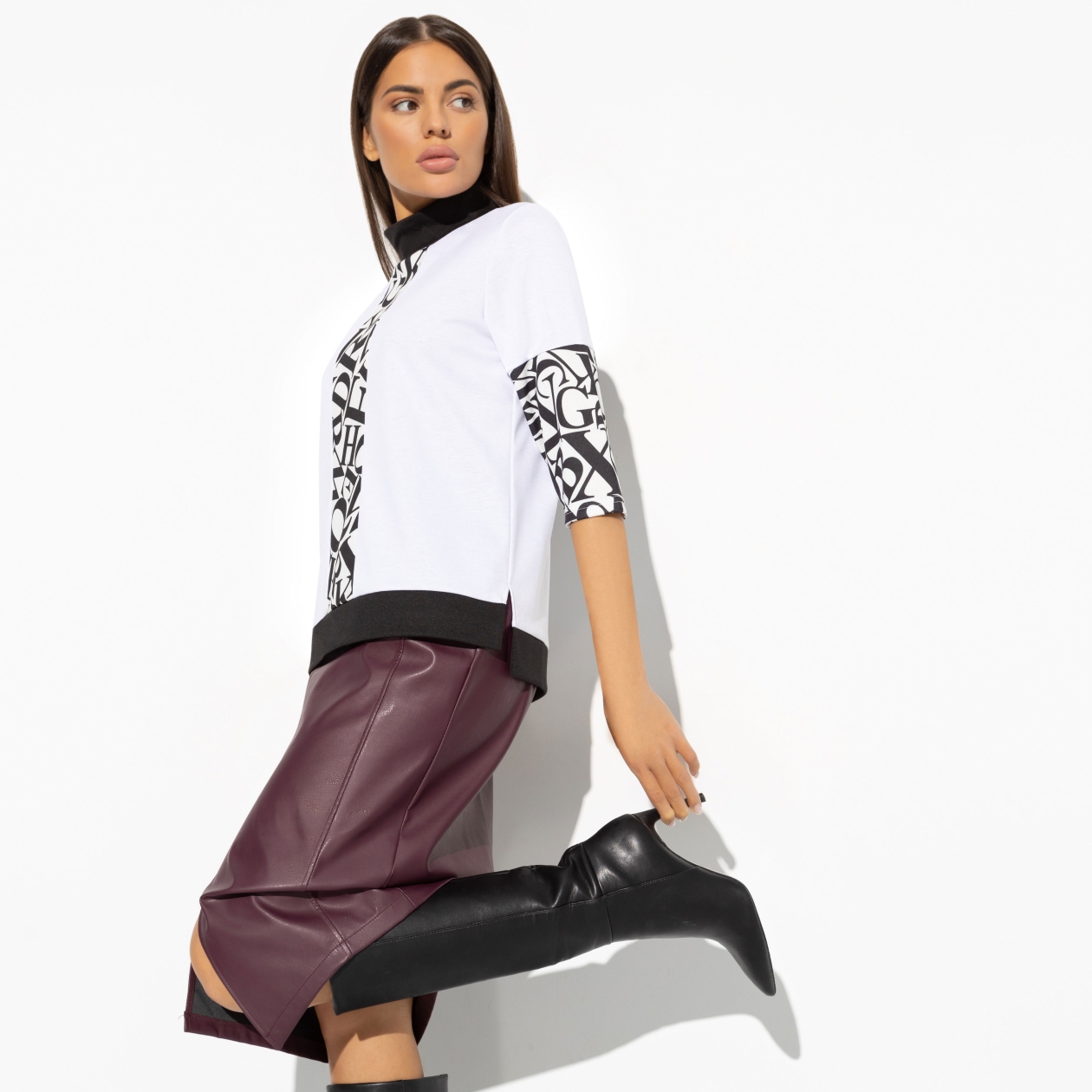 Интеллектуальный фешн – как много в этой фразе. Быть осознанным в каждом своем выборе, значит, свести к минимуму риск ошибки. Водолазка с алфавитным принтом – еще одно доказательство того, что вы на правильном модном пути. Водолазка прямого силуэта. Комбинация трех видов ткани. Акцентные вставки прошиты. Есть деликатные разрезы по бокам изделия.