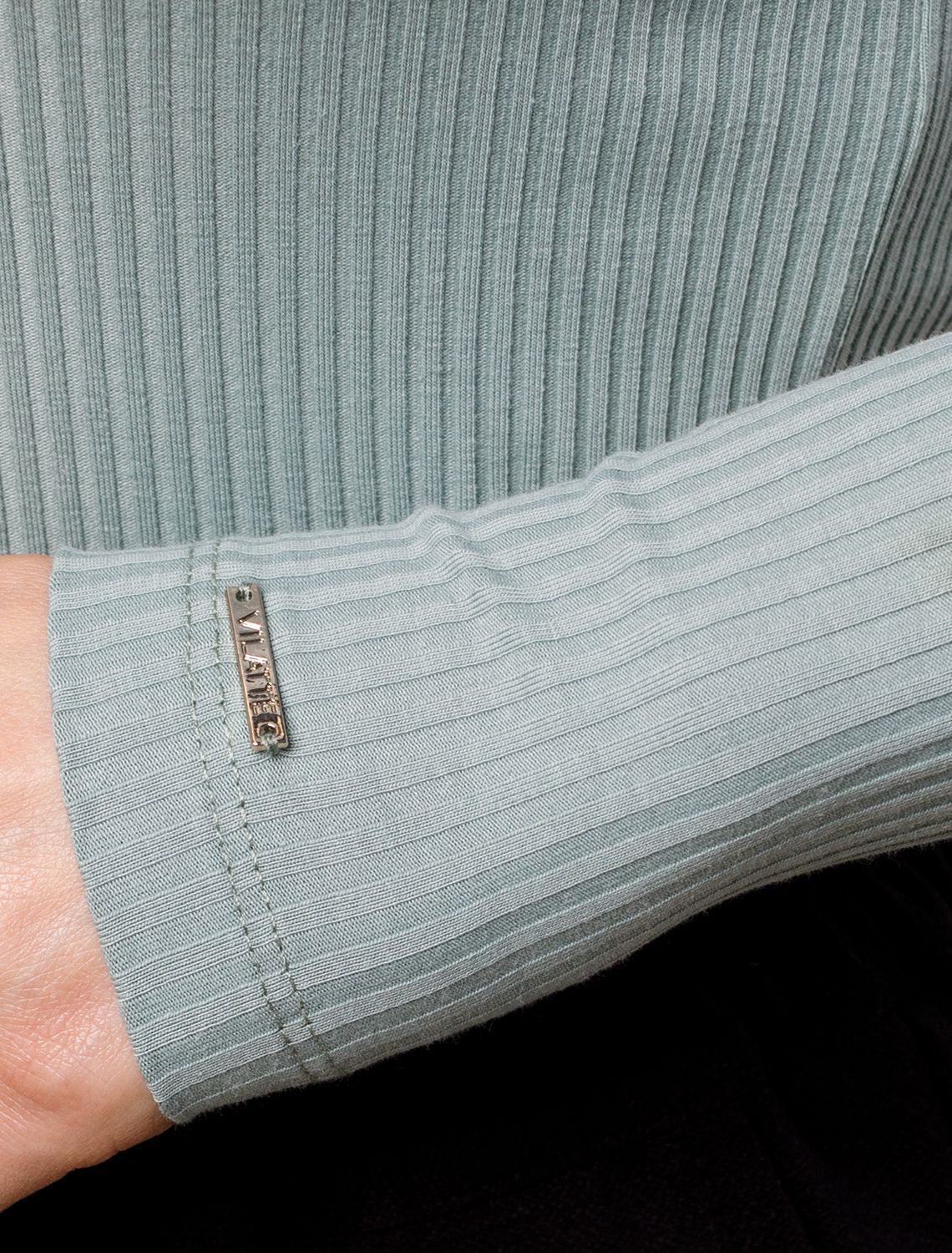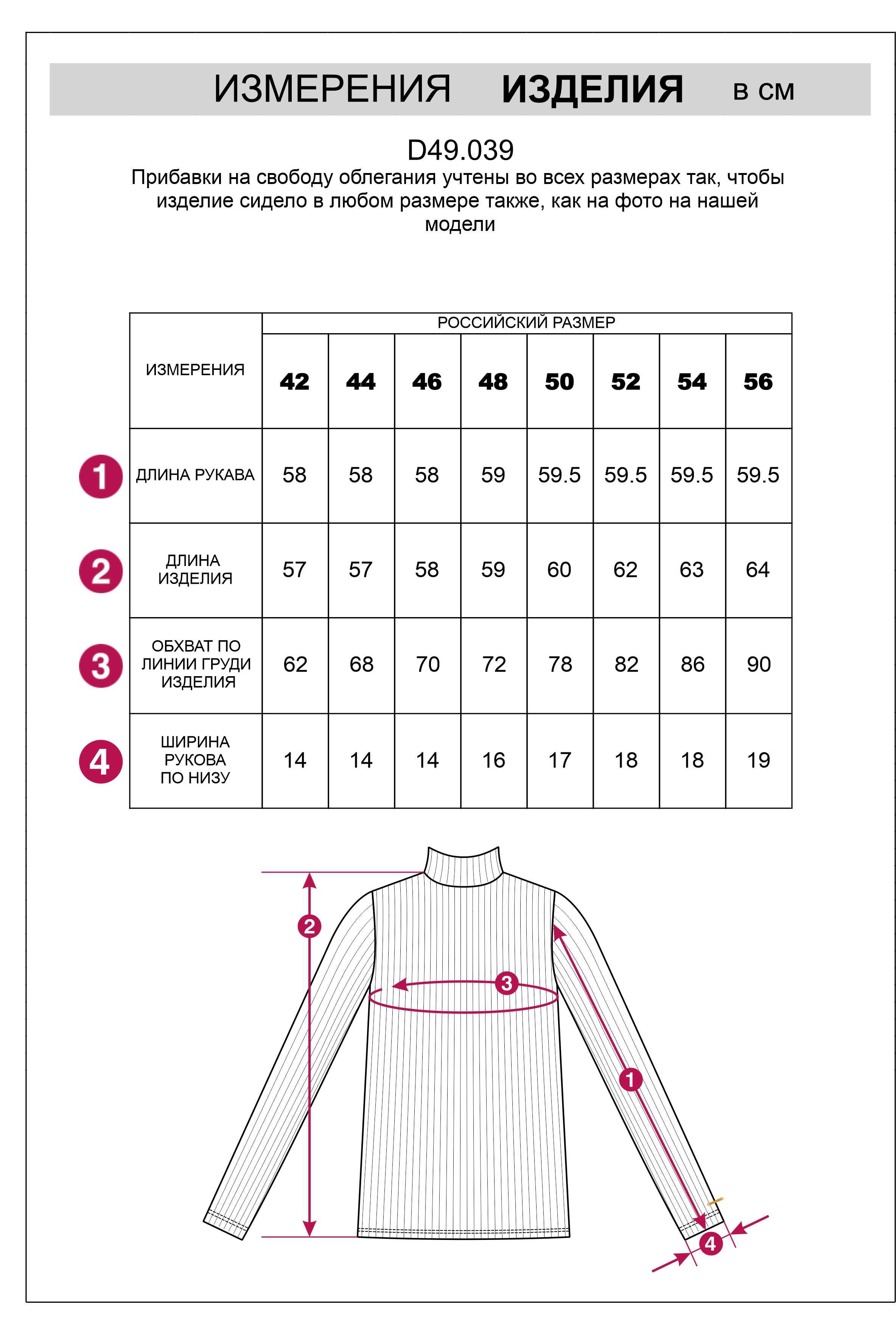 Водолазка выполнена из фактурного трикотажа в широкий рубчик. Модель с узким рукавом хорошо сидит по фигуре, подчеркивая достоинства. Полотно слаборастяжимое, рекомендуем брать изделие четко в соответствии с размером, а кто любит чуть свободнее — то на размер больше. Хлопковый трикотаж поддерживает оптимальную температуру тела, поэтому в изделии будет комфортно в течении всего дня. Наличие эластана в составе гарантирует формоустойчивости. Водолазка отлично впишется в деловой дресс-код и подойдет для повседневного аутфита.