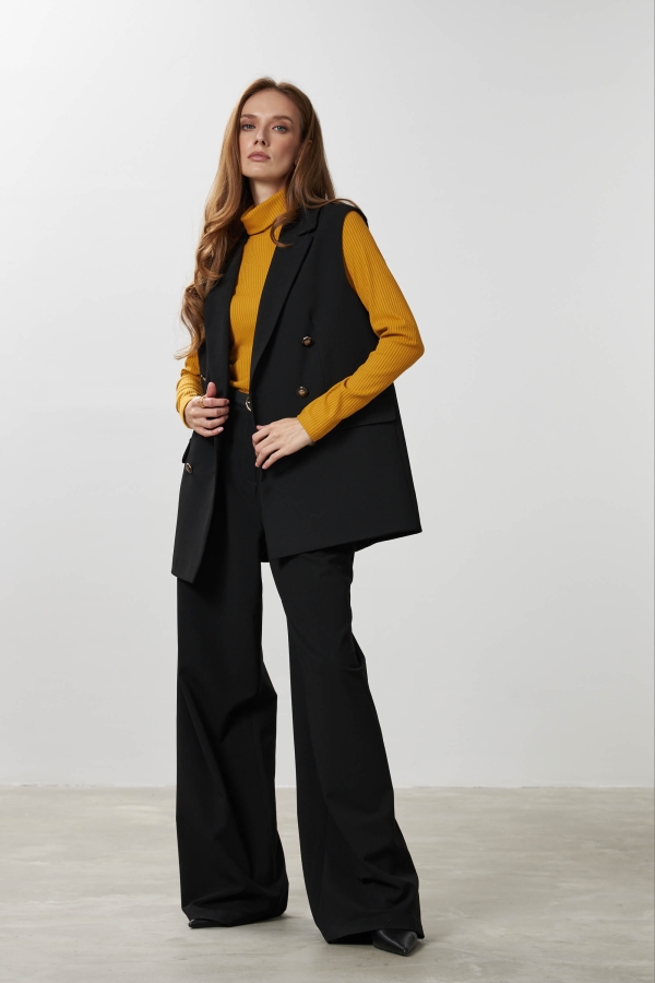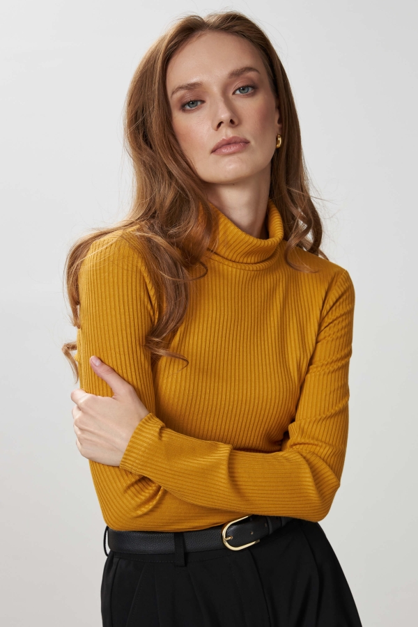 Джемпер из трикотажного полотна в рубчик. Модель прилегающего силуэта, длинный втачной рукав, воротник стойка.