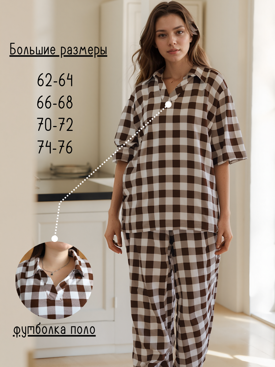 Костюм домашний с брюками больших размеров от ВРазмере это идеальный выбор для комфортного отдыха дома. Этот трикотажный комплект, выполненный из 100% хлопка, подарит вам ощущение нежности и мягкости на коже. Модель представлена в красивом принте в клетку бордового цвета, который всегда актуален и придает образу стильный вид. Футболка поло с коротким рукавом и V-образным вырезом горловины обеспечивает удобство и свободу движений. Широкие брюки палаццо с высокой посадкой подчеркнут вашу фигуру и создадут элегантный силуэт. Этот костюм станет прекрасным подарком на любой праздник, будь то Новый год или день рождения. Он подойдет женщинам больших размеров, а также беременным, так как его покрой разработан специально для комфорта и удобства. Благодаря своей универсальности, костюм можно носить круглый год, создавая уютные образы для дома. Легко ухаживать за костюмом: достаточно стирать его при температуре не более 40C. Выбирайте комфорт и стиль с костюмом домашним от ВРазмере!