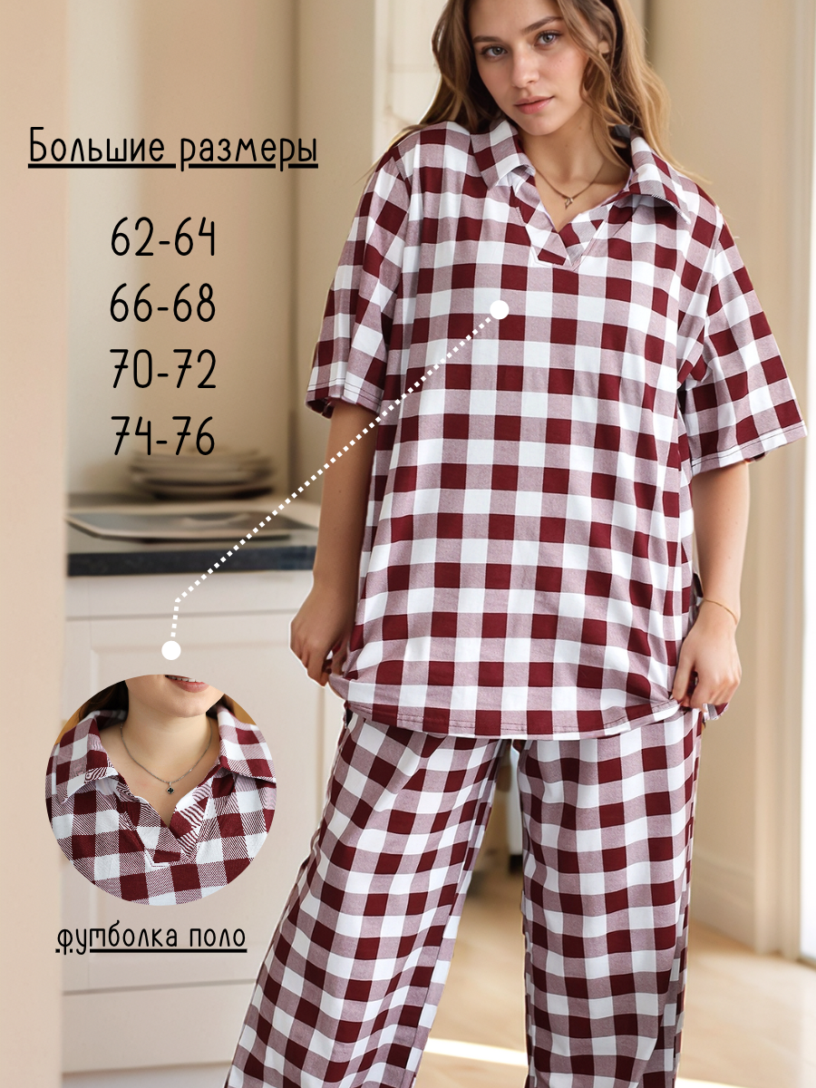 Костюм домашний с брюками больших размеров от ВРазмере это идеальный выбор для комфортного отдыха дома. Этот трикотажный комплект, выполненный из 100% хлопка, подарит вам ощущение нежности и мягкости на коже. Модель представлена в красивом принте в клетку бордового цвета, который всегда актуален и придает образу стильный вид. Футболка поло с коротким рукавом и V-образным вырезом горловины обеспечивает удобство и свободу движений. Широкие брюки палаццо с высокой посадкой подчеркнут вашу фигуру и создадут элегантный силуэт. Этот костюм станет прекрасным подарком на любой праздник, будь то Новый год или день рождения. Он подойдет женщинам больших размеров, а также беременным, так как его покрой разработан специально для комфорта и удобства. Благодаря своей универсальности, костюм можно носить круглый год, создавая уютные образы для дома. Легко ухаживать за костюмом: достаточно стирать его при температуре не более 40C. Выбирайте комфорт и стиль с костюмом домашним от ВРазмере!