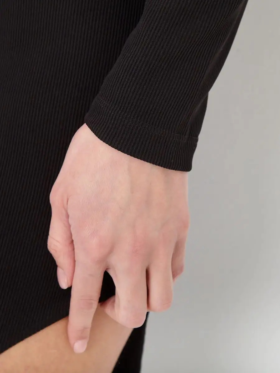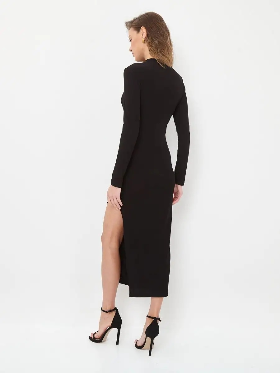 Дополните свой гардероб трикотажным платьем длины миди. Удобный крой и приятная ткань изделия позволят провести в комфорте и тепле весь день. А интересные детали в виде имитации запаха, разреза на ноге и стойкого ворота добавят образу шарма и стиля. Платье в таком базовом цвете отлично подойдет для офиса, романтичной прогулки, похода в гости или на новогодний корпоратив.