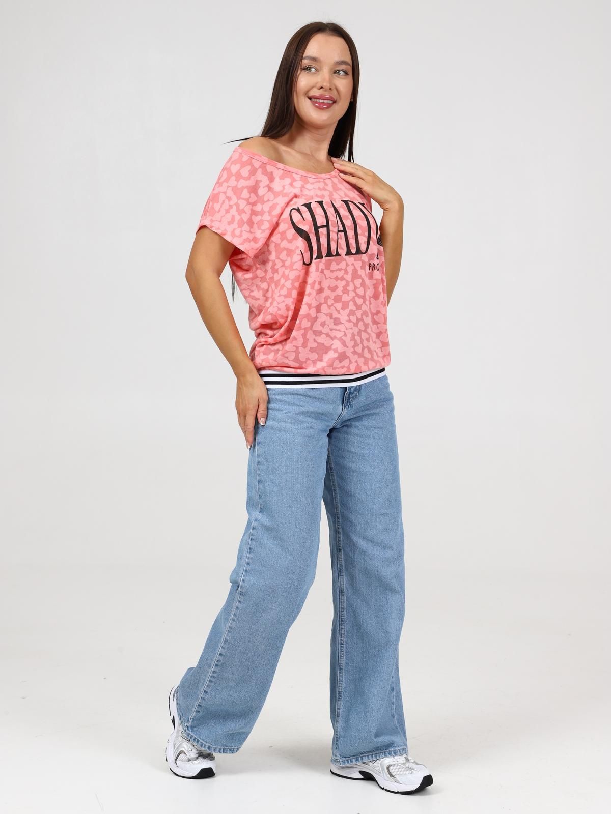 Женская футболка выполнена из трикотажного полотна "деворе". Футболка свободная со спущенным плечом, круглая горловина обработана обтачкой из основной ткани, низ футболки на поясе из декоративной эластичной тесьмы, передняя часть футболки декорирована принтом.