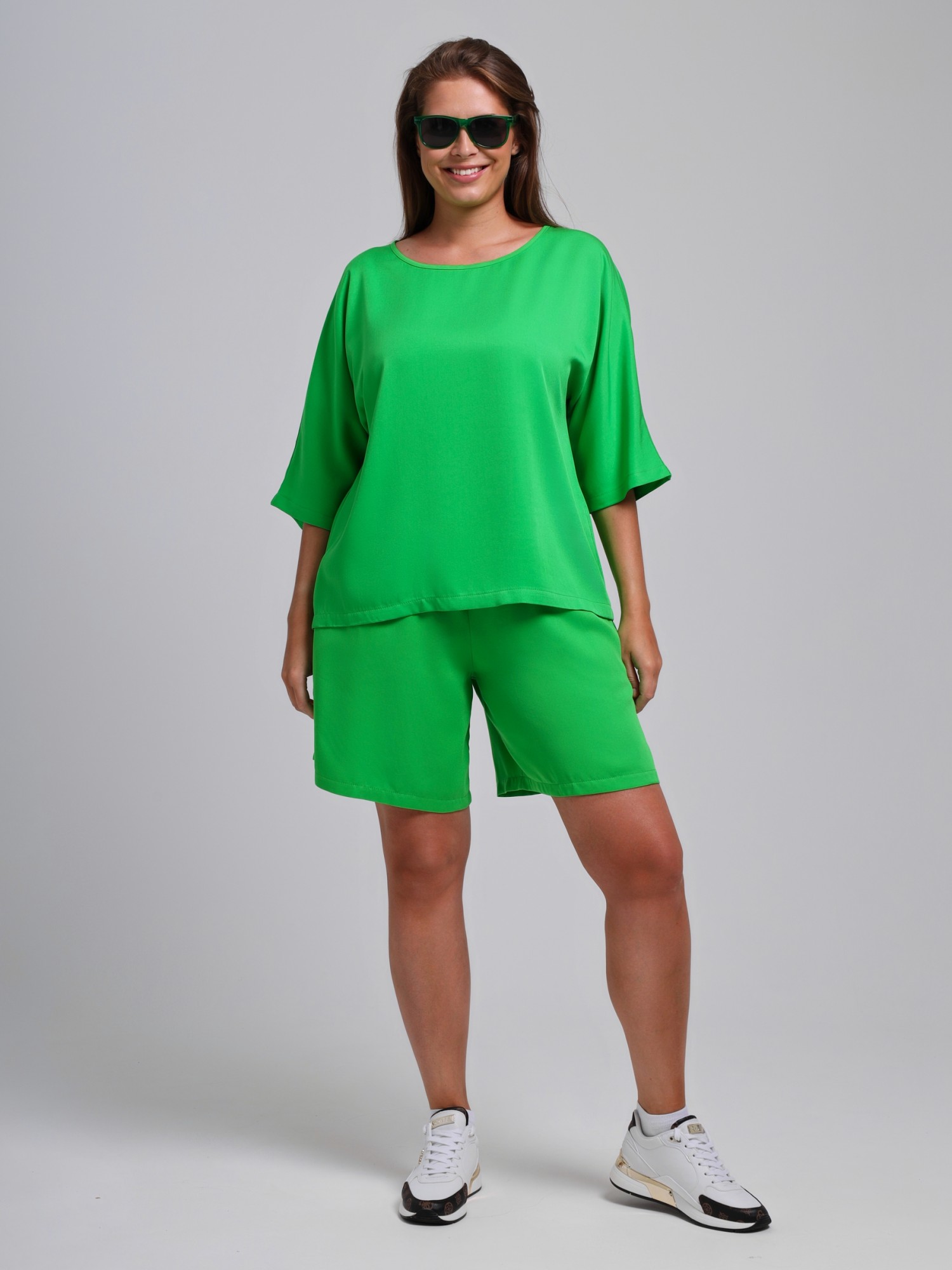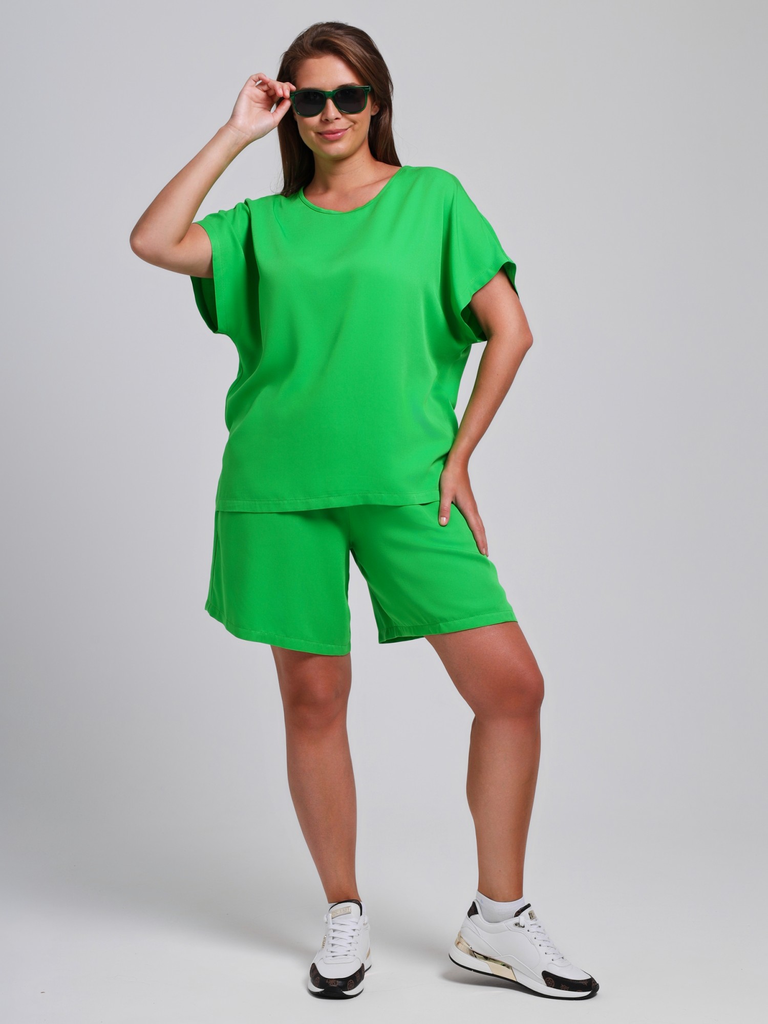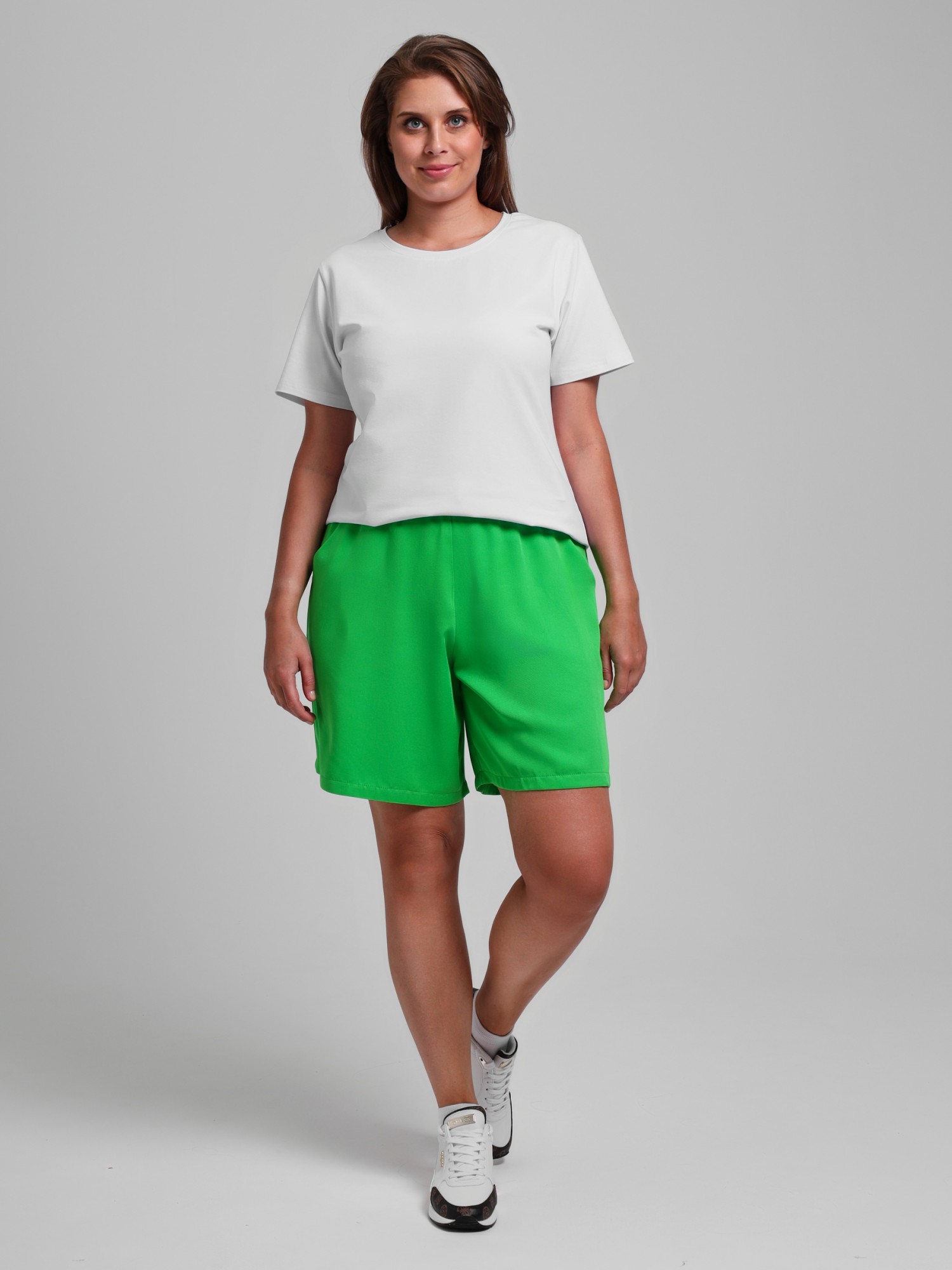 Шорты женские из гладкокрашеного тканого штапельного полотна, свободные, с карманами в боковых швах, на притачном поясе с эластичной тесьмой внутри. Средний шов передних половин обработан имитацией «гульфика»,