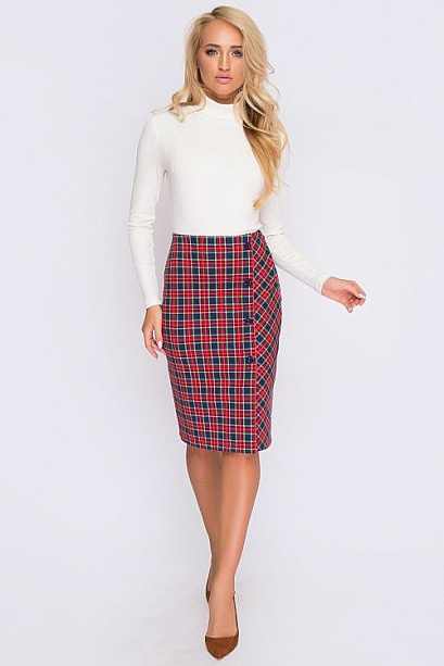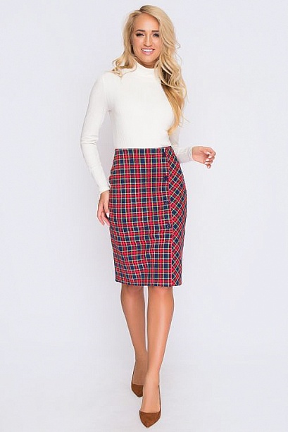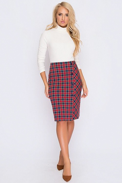 Юбка из трикотажа в клетку с имитацией застежки и разрезом по переду.